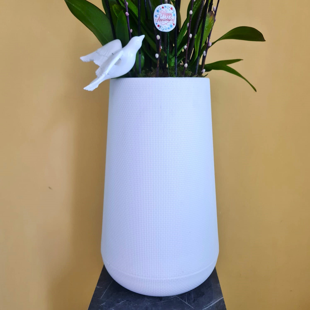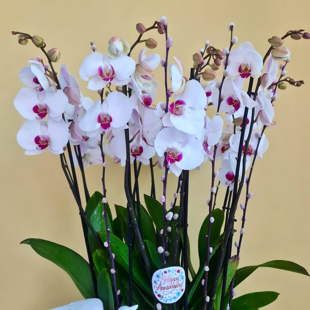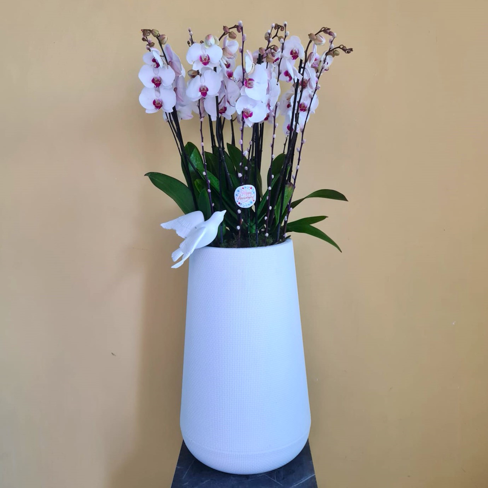 زهرة فالاينوبسيس ذات الشفاه الحمراء في أصيص أبيض.