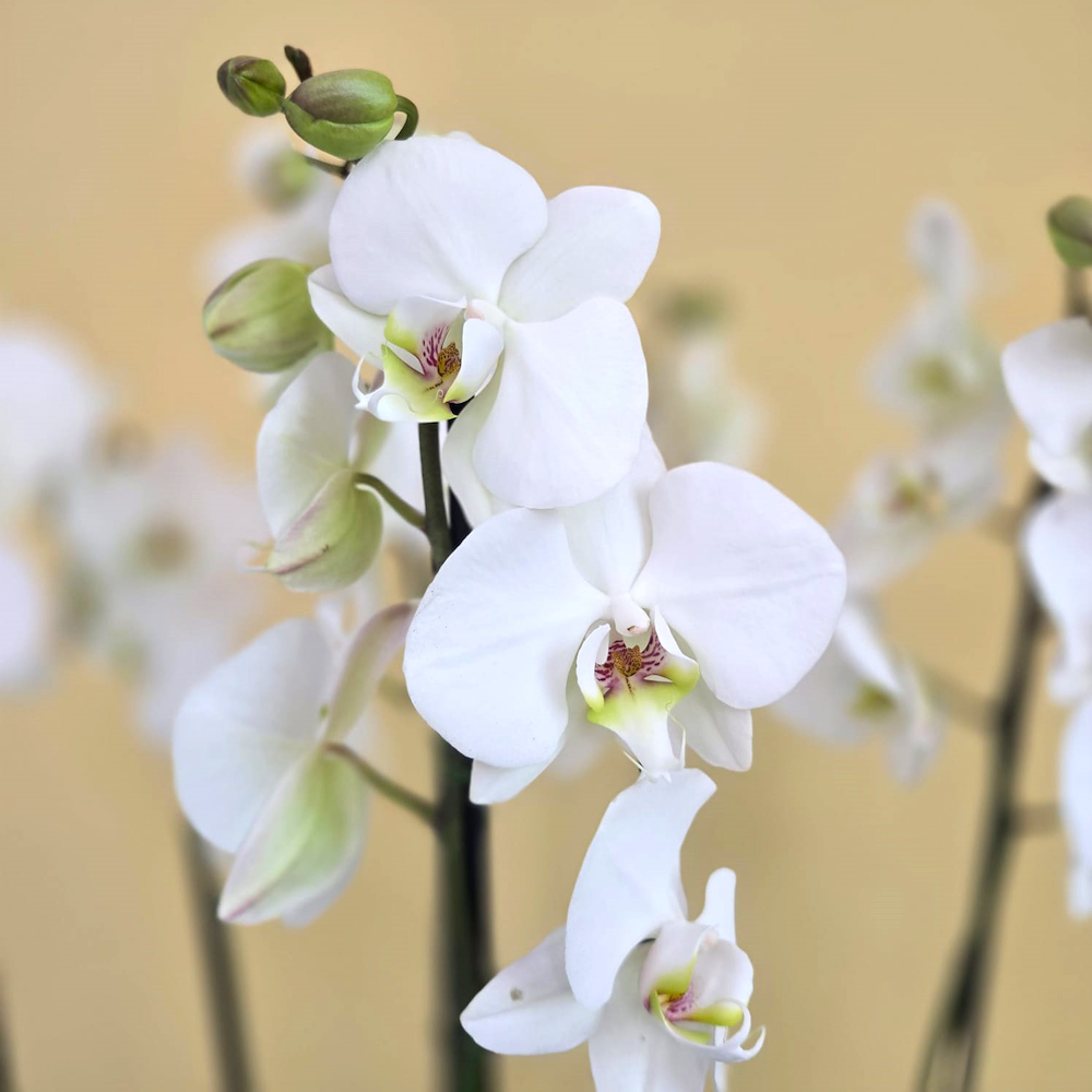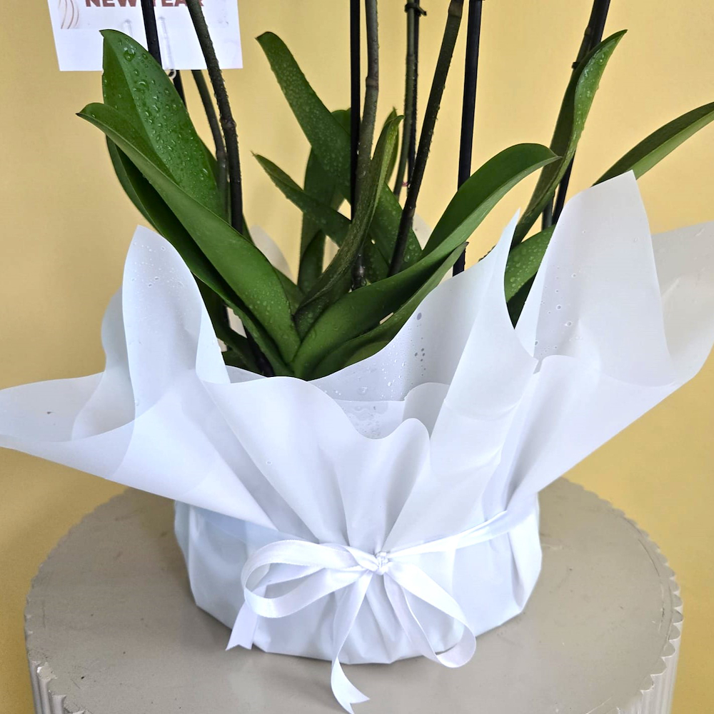 زهرة الفالاينوبسيس البيضاء مزروعة في مزهرية زجاجية مغلفة.