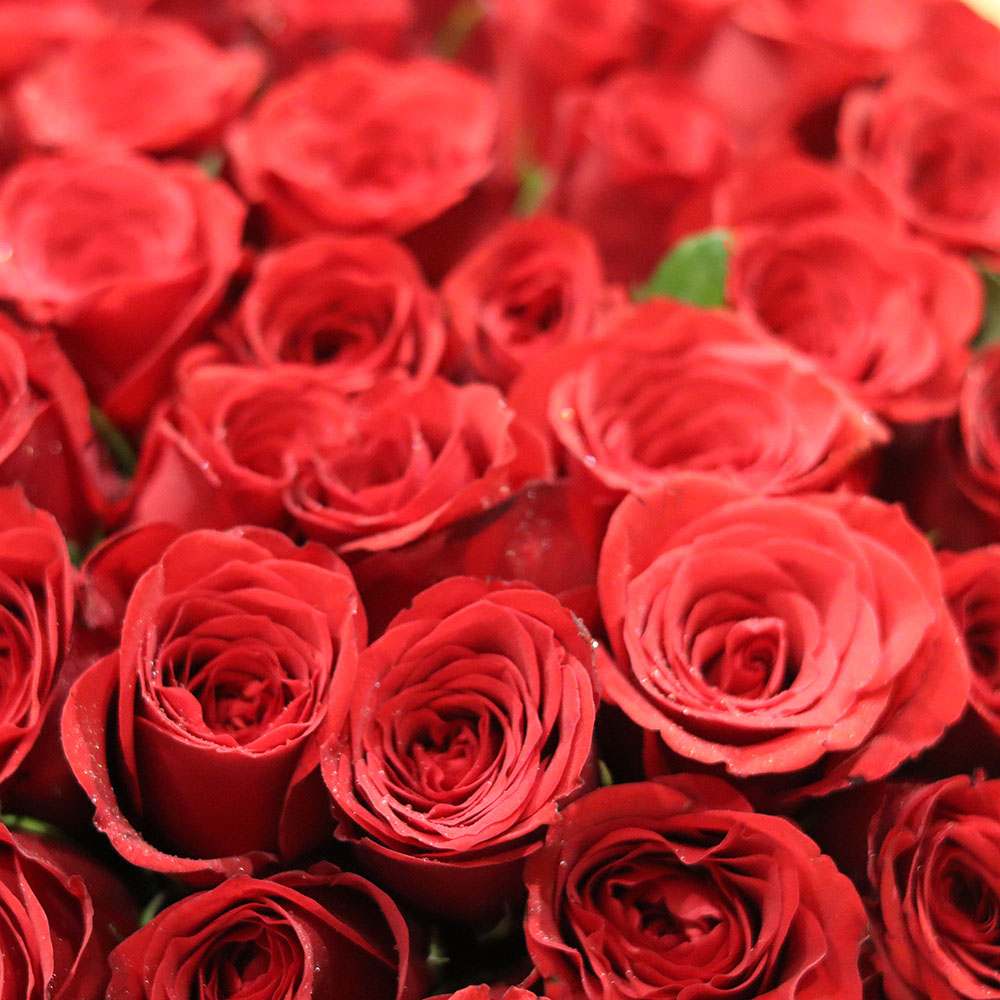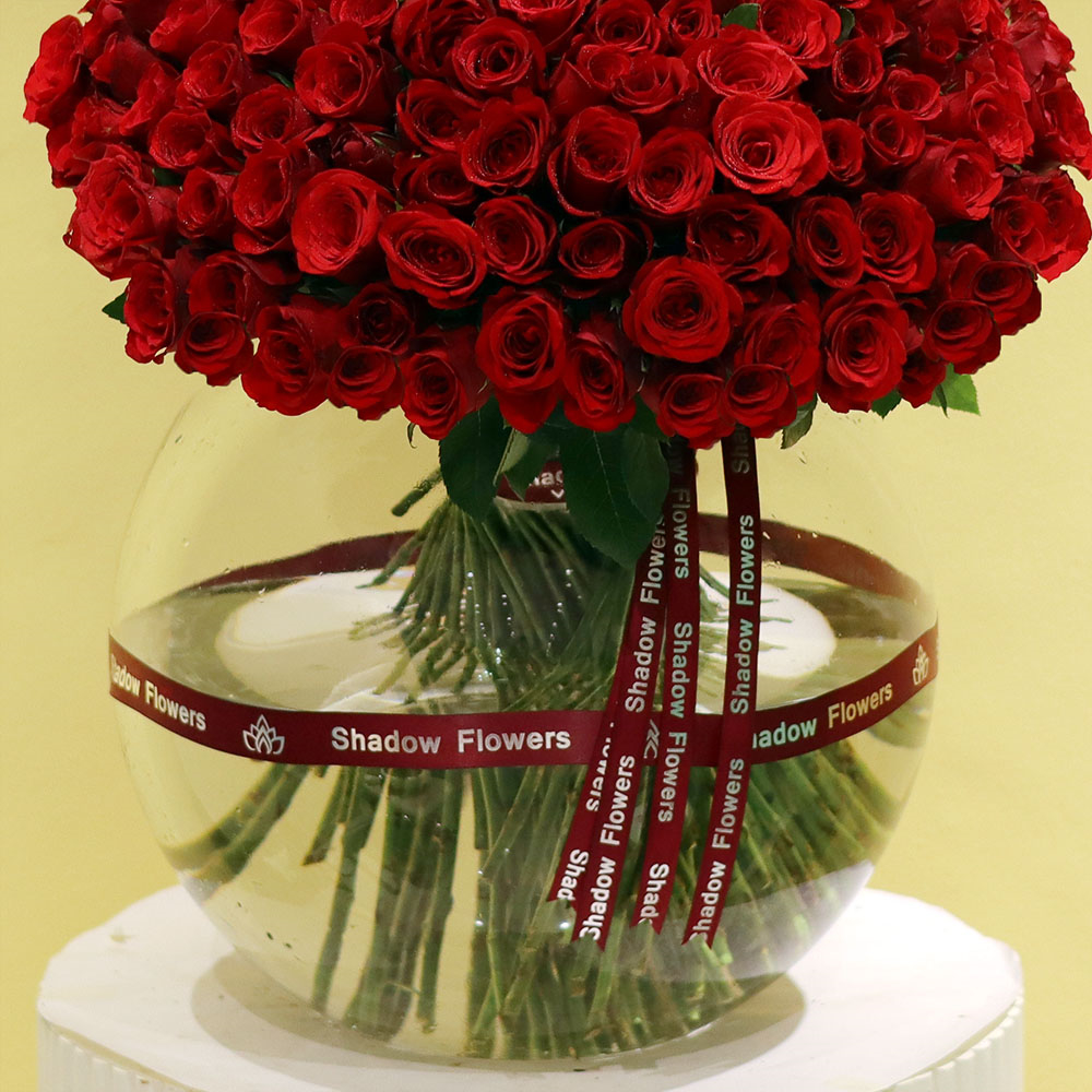150 قطعة جوري حمراء جميلة مرتبة في وعاء زجاجي.