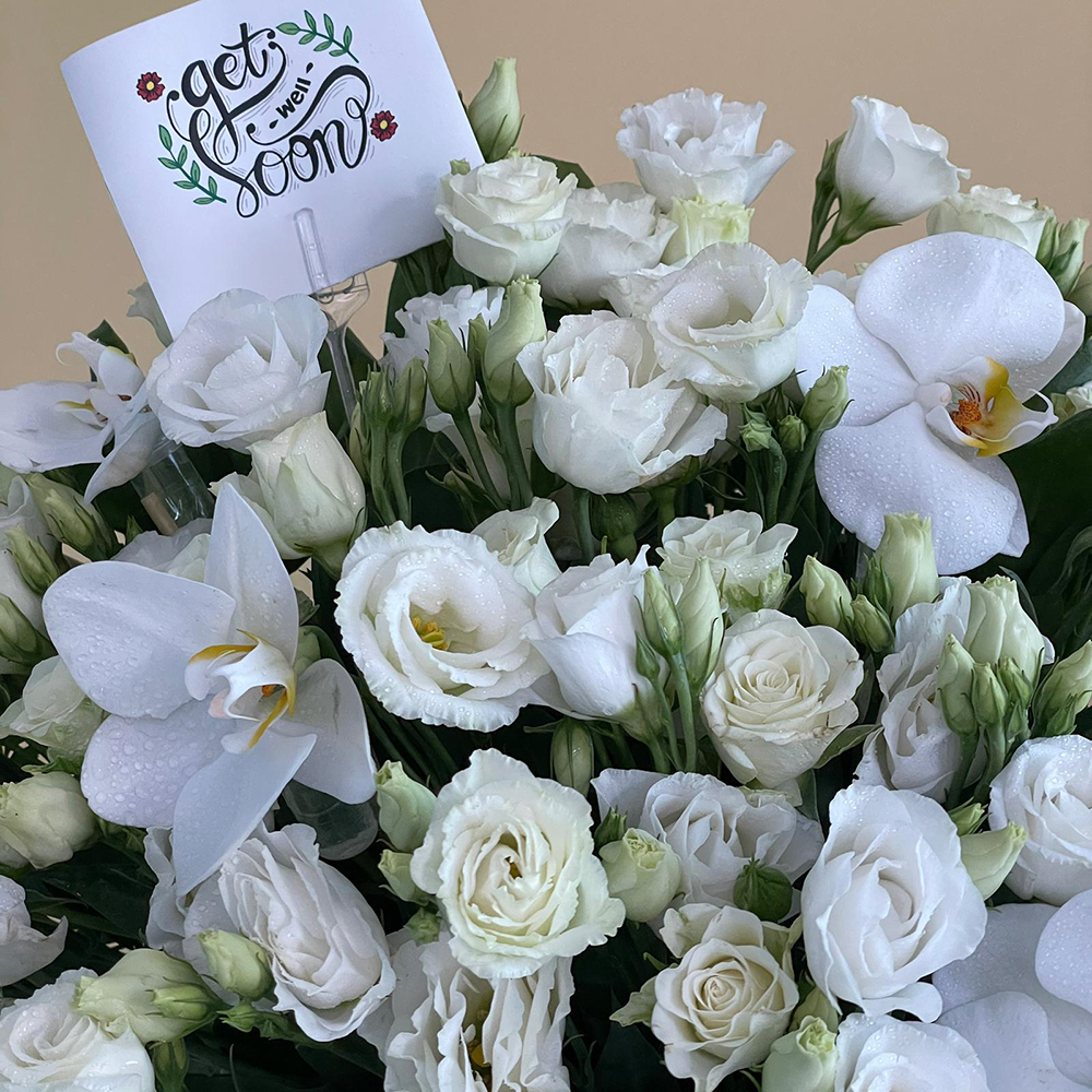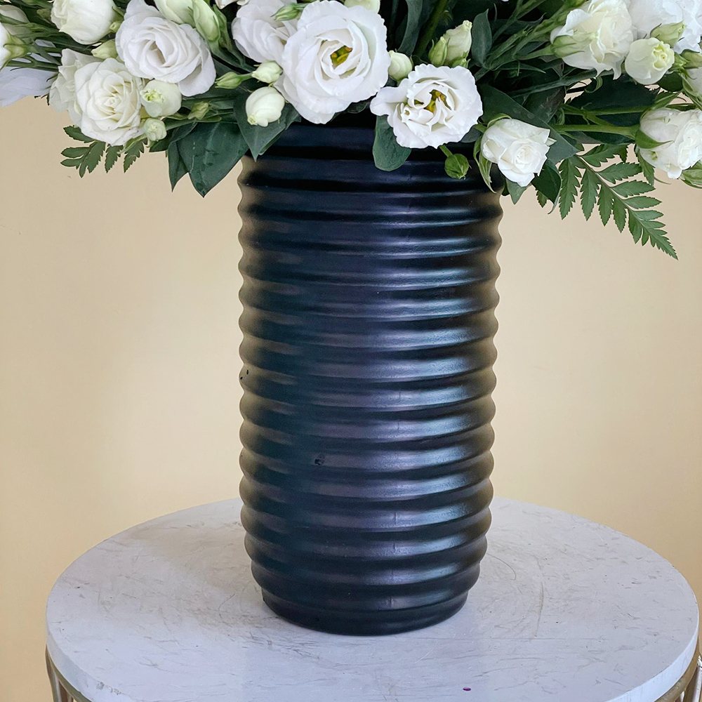 تنسيق جميل لوجه واحد من زهور الجوري، الليزيانثوس والأوركيد البيضاء، مرتبة في فازة زجاجية سوداء.