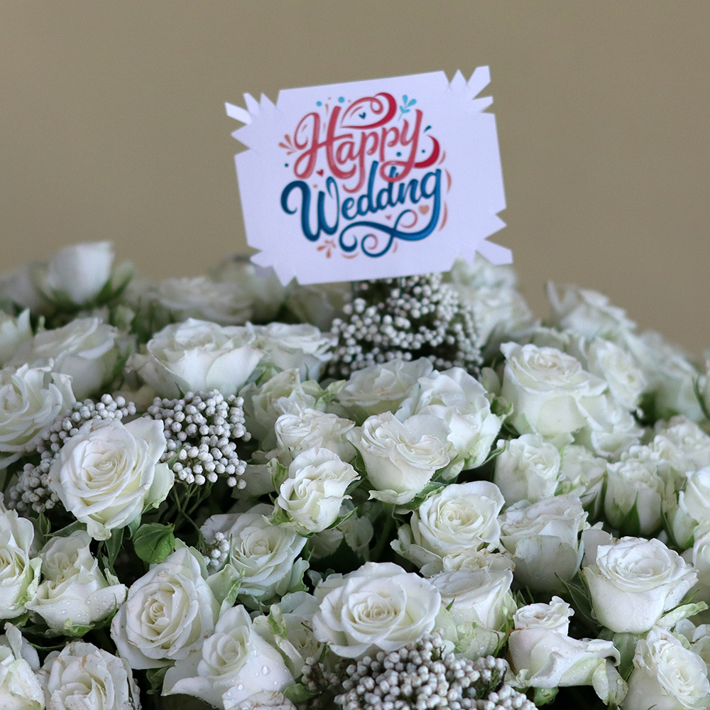 باقة تحتوي على البيبي جوري الأبيض وزهور الأرز، مرتبة بشكل جميل في فازة دائرية فاخرة.