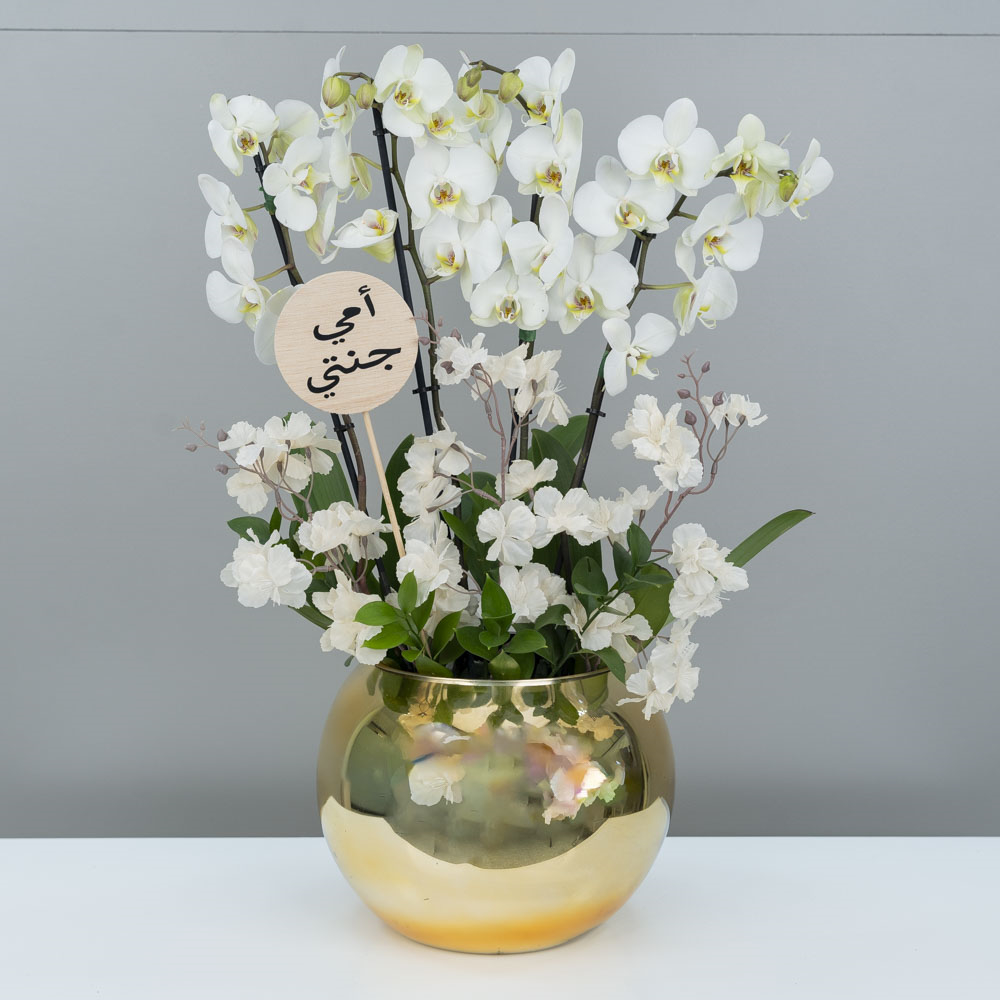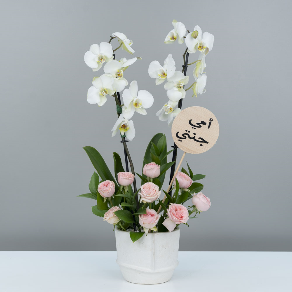 هذه الباقة تحتوي على زهور الجوري، التوليب والجيربيرا مع الموكارا.