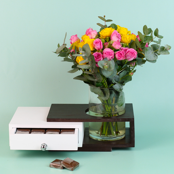 هذه الباقة تحتوي على مزيج من زهور الجوري مع الشوكولاتة.