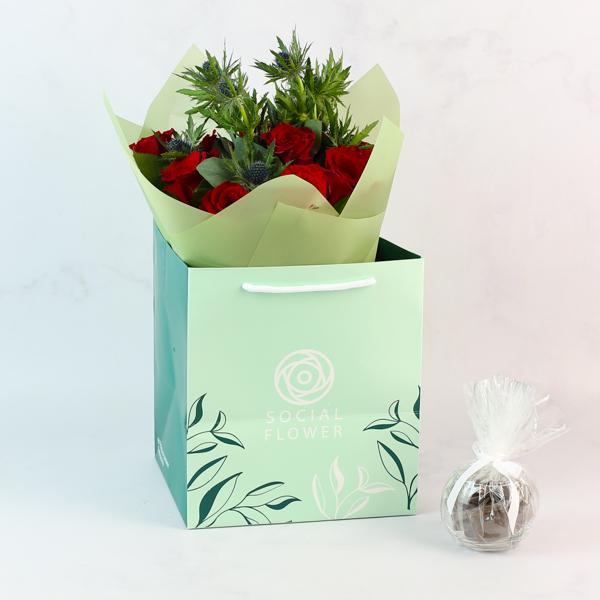 هذه باقة يد تحتوي على زهور الجوري والغابات الخضراء مع الشوكولاتة.