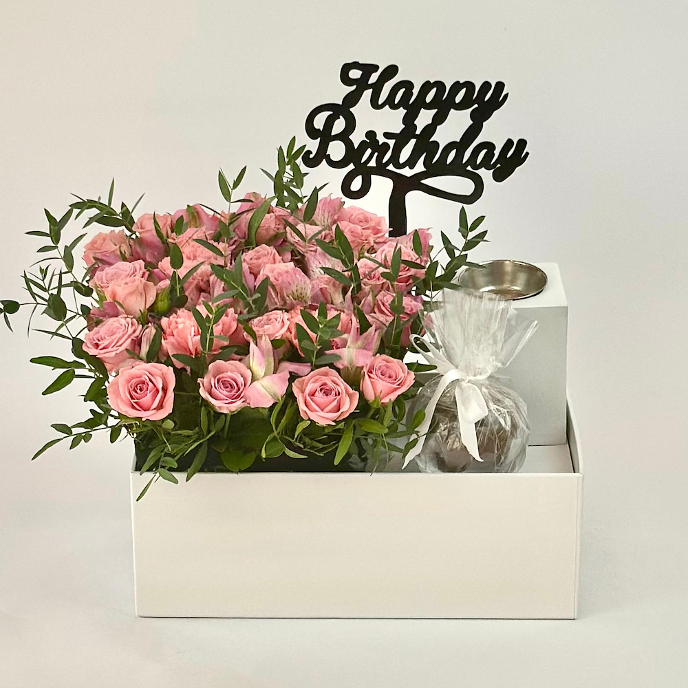 صندوق يحتوي على زهور الألستروميريا، الكريز والبيبي جوري مع الشوكولاتة ومبخر.