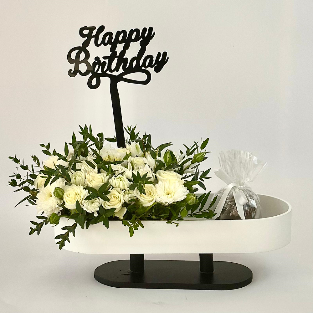 طاولة تحتوي على زهور الجوري، الألستروميريا والكريز مع الشوكولاتة.