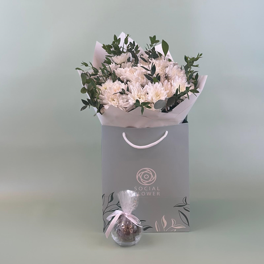 باقة يد تحتوي على زهور الكريز والأوراق الخضراء مع الشوكولاتة.