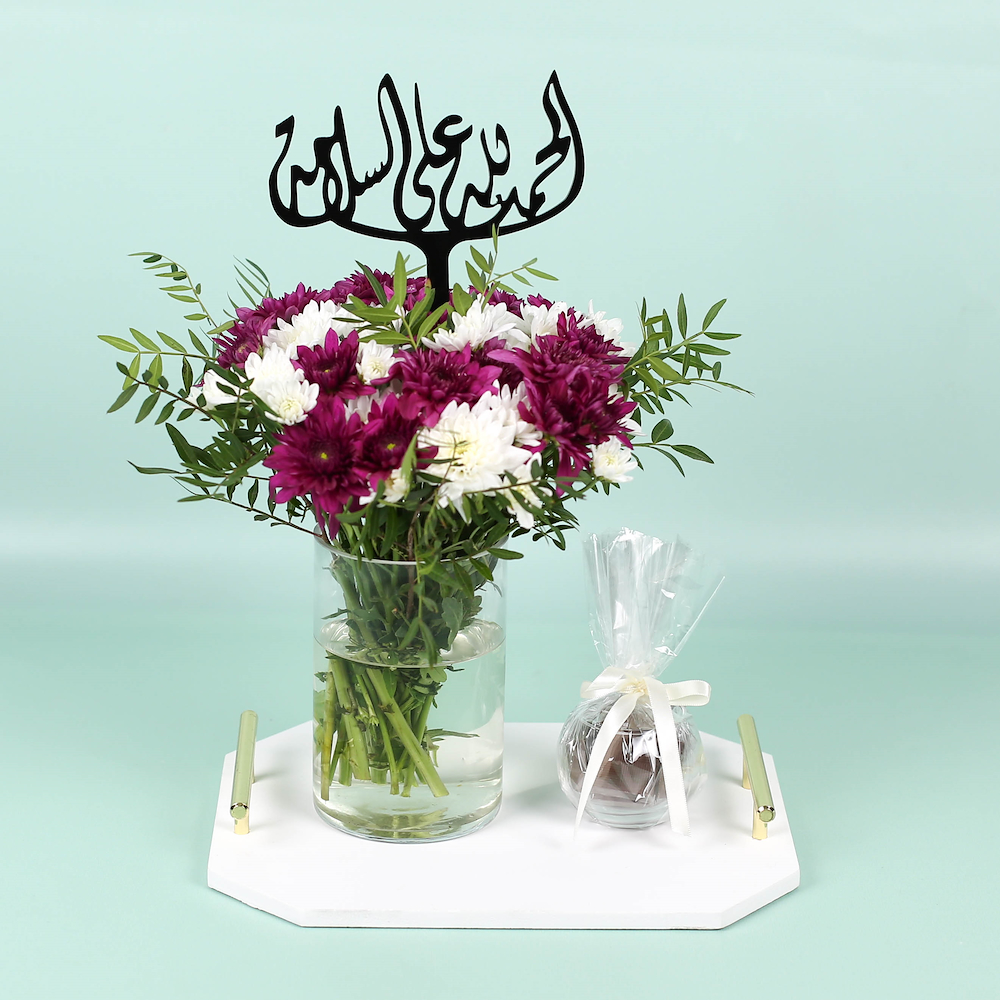 باقة تحتوي على زهور الكريز مع الشوكولاتة.