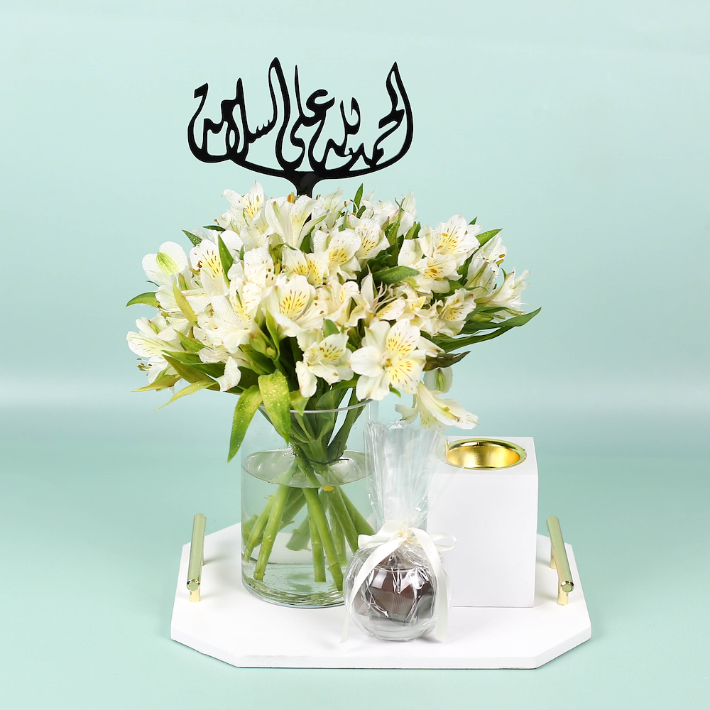 تحتوي هذه الباقة على أزهار الألستروميريا مع الشوكولاتة ومبخر.