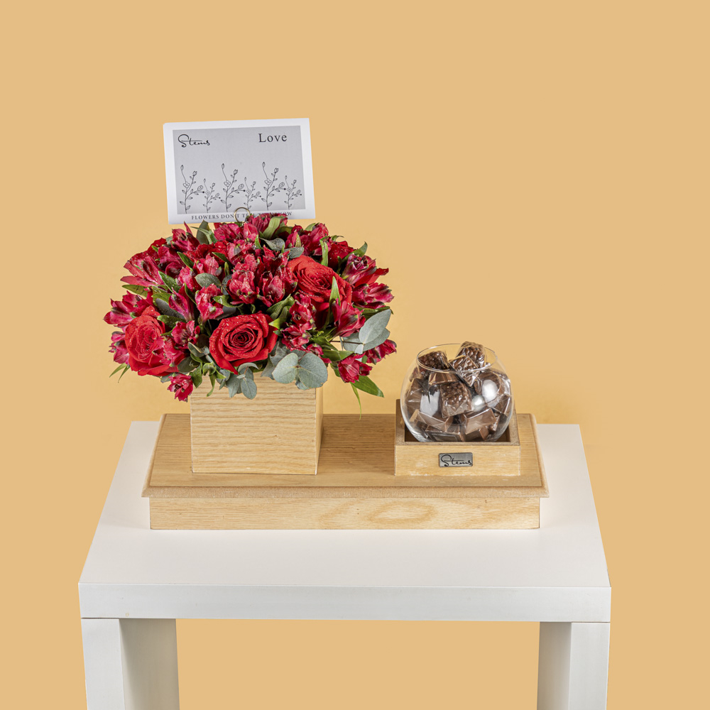 صينية خشبية تحتوي على الجوري والألستروميريا مع شوكولاتة بلجيكية.