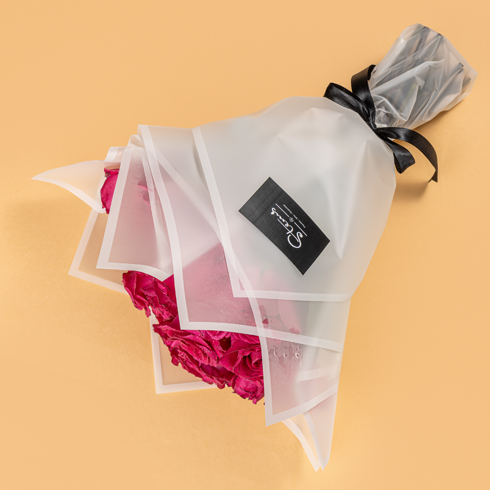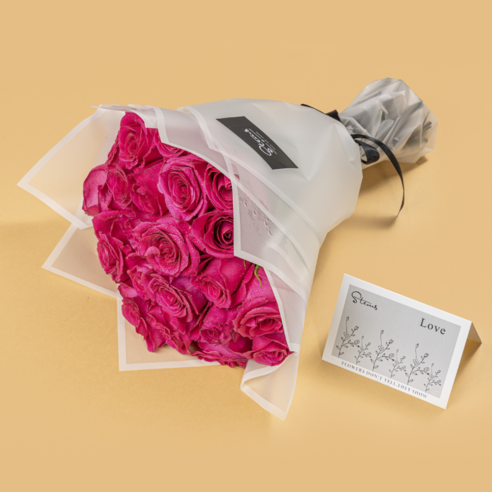 باقة زهور يدوية تضم 25 وردة فوشية اللون، مغلفة بورق أبيض.