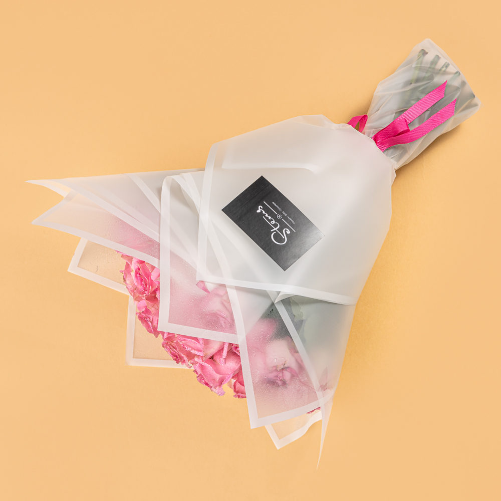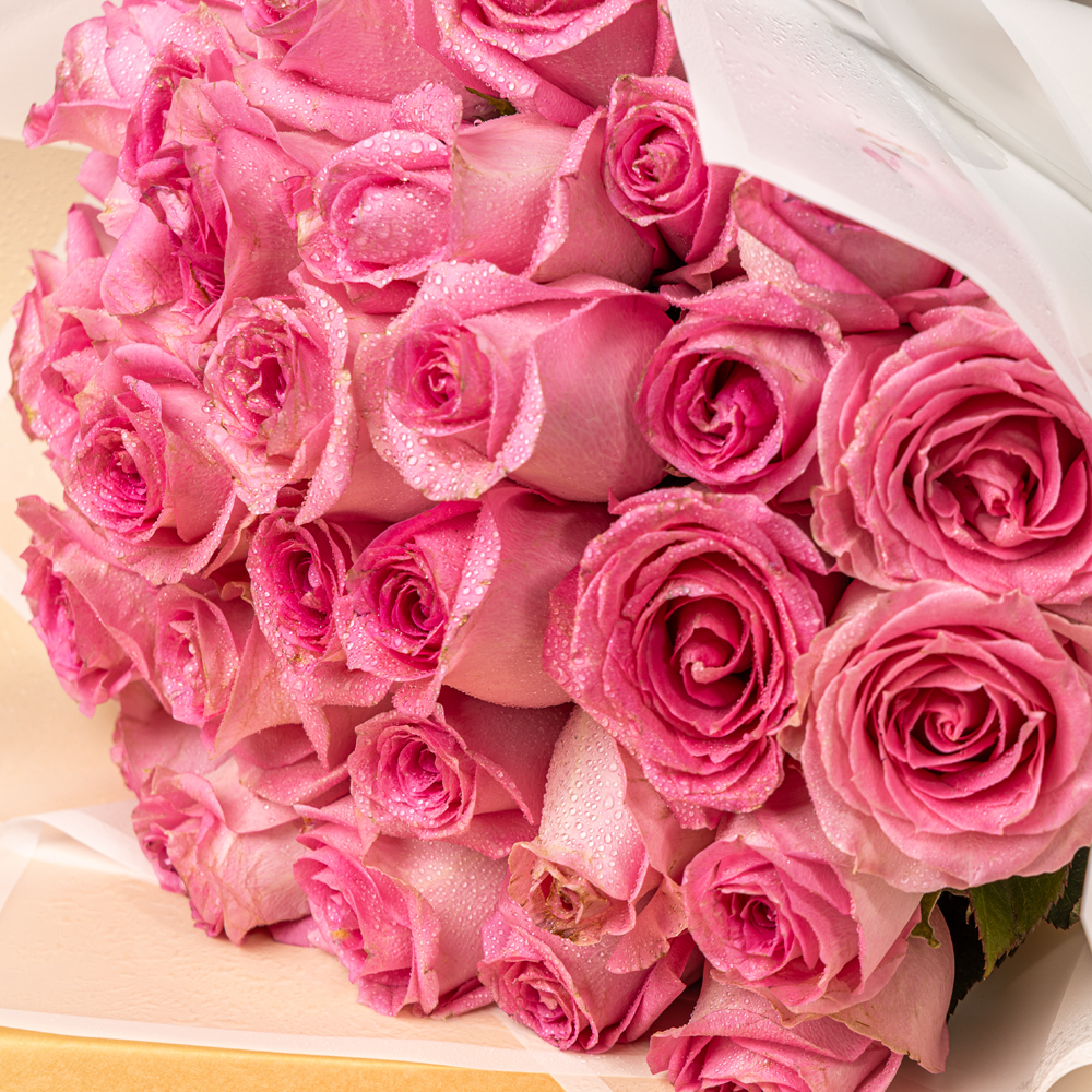 باقة يد مليئة بـ 25 جوري وردية مغلفة بغطاء أبيض.