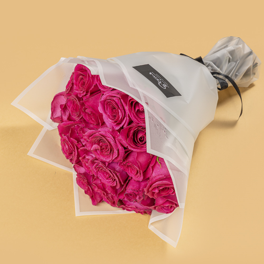باقة تحتوي على زهور الليلي البيضاء، مرتبة بشكل جميل في فازة زجاجية.