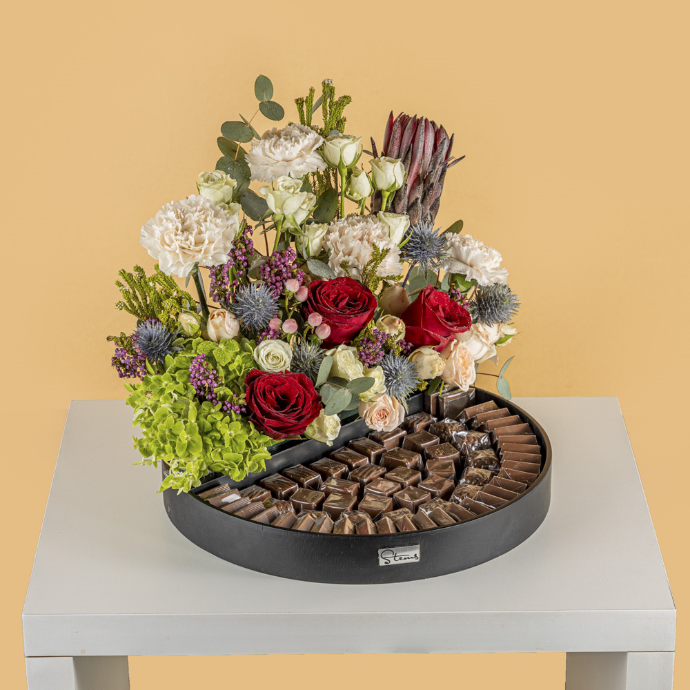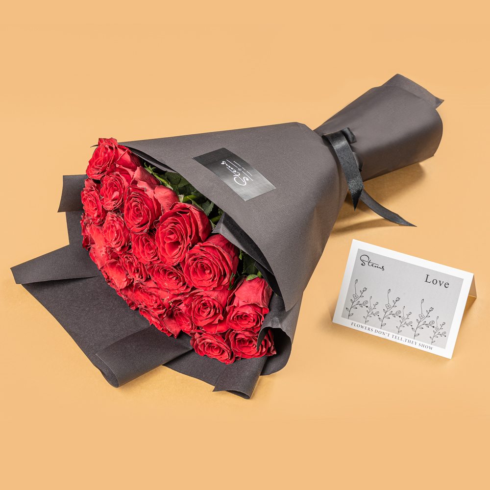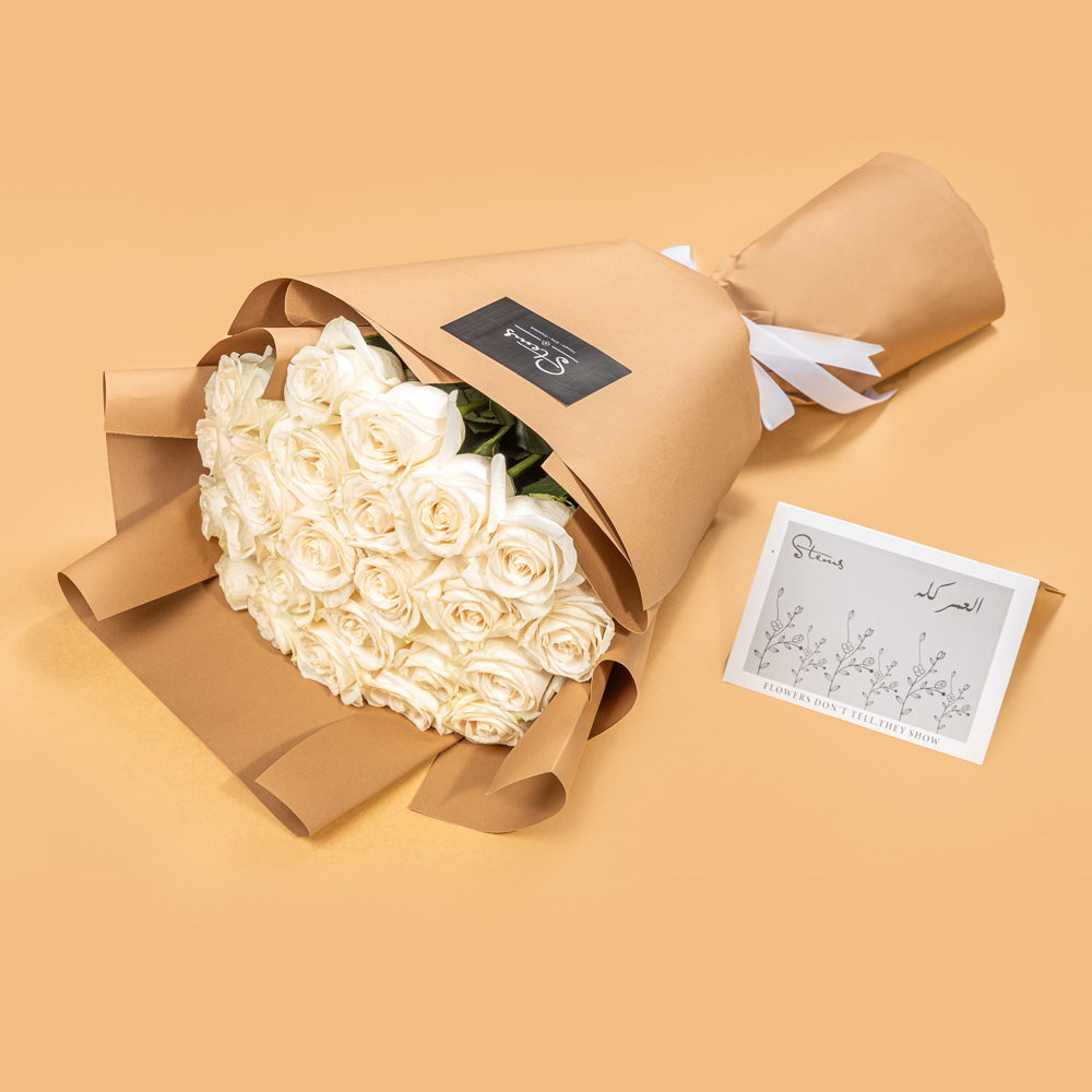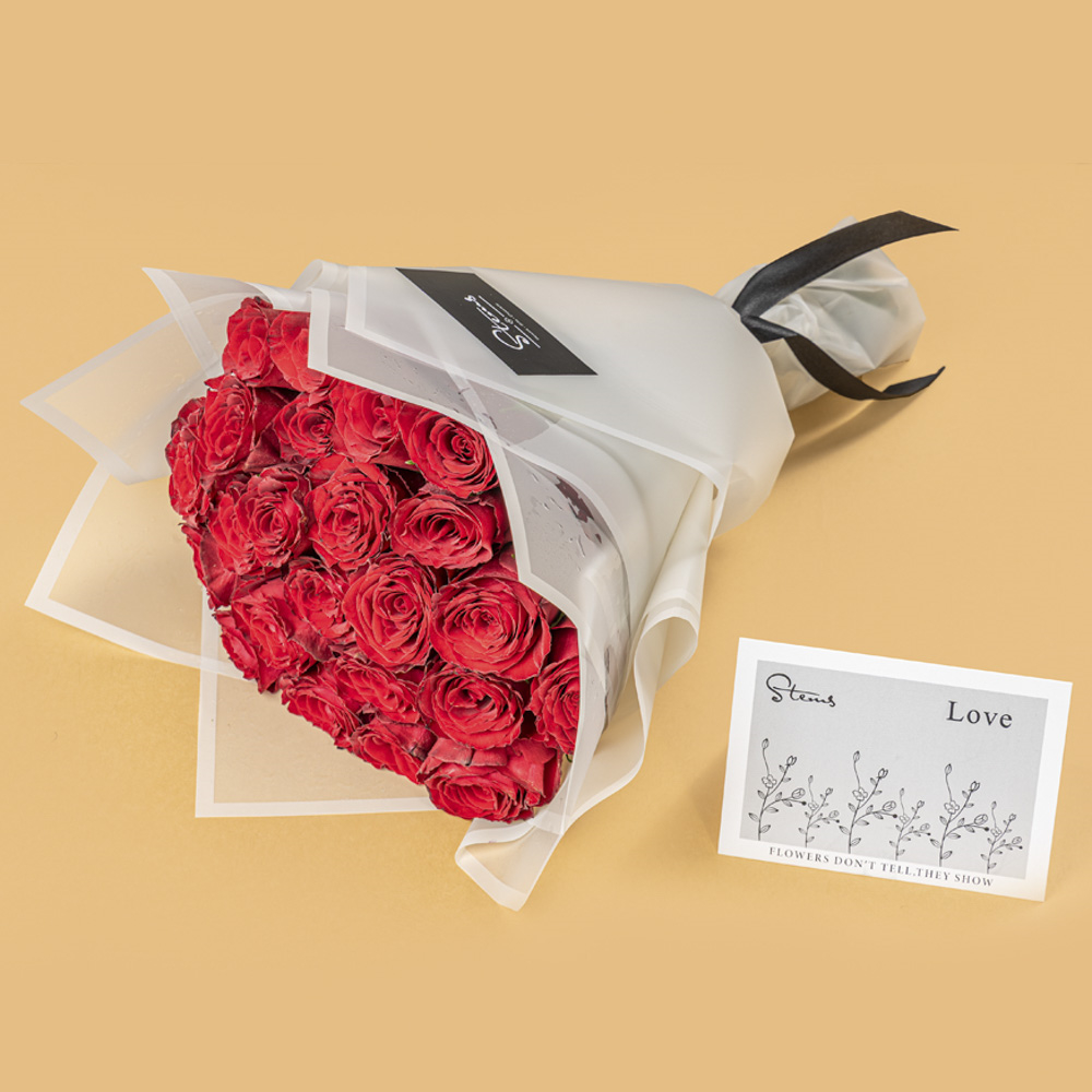 باقة تحتوي على 30 زهرة توليب وردية، مرتبة بشكل جميل في فازة زجاجية.