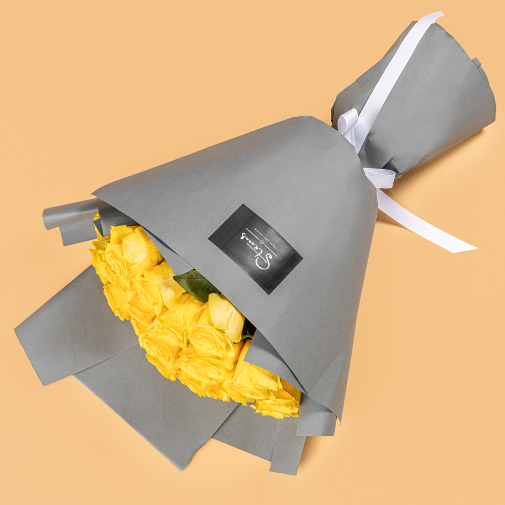 باقة يد مليئة بـ 25 جوري صفراء بتغليف مميز.