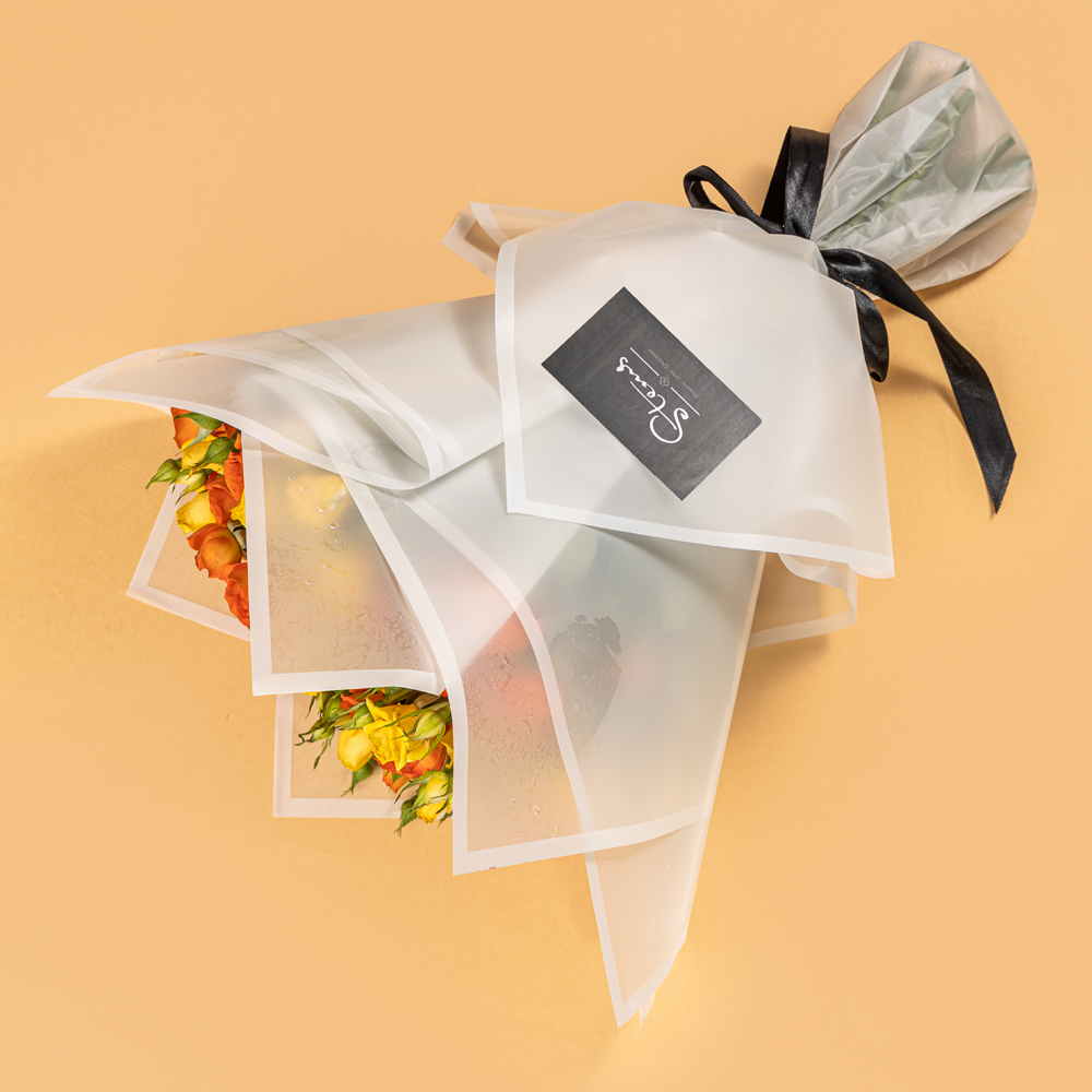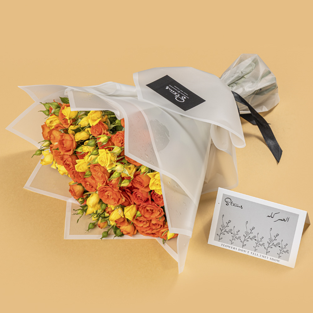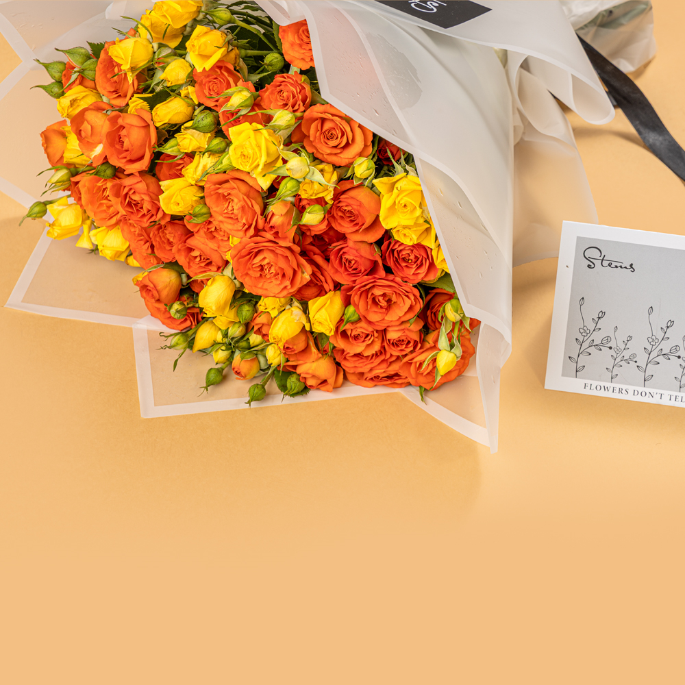 باقة يدوية من 25 جوري صغيرة صفراء وبرتقالية، مغلفة بورق أبيض.