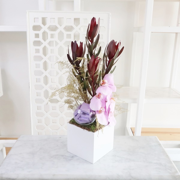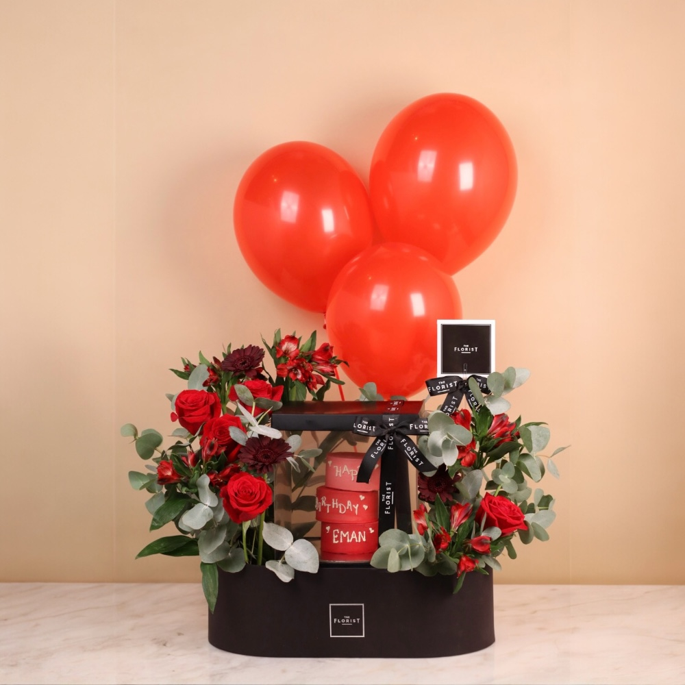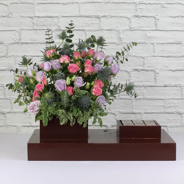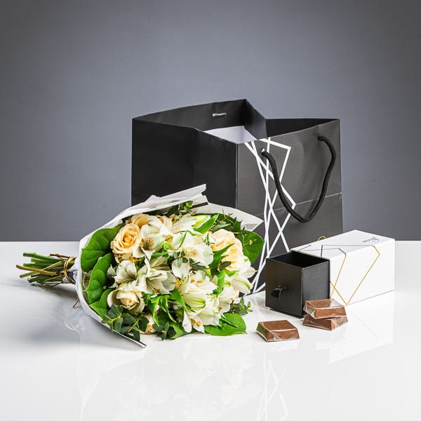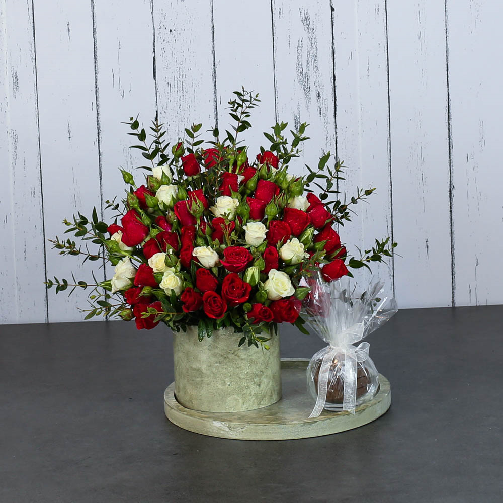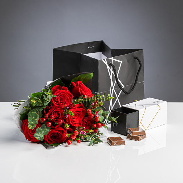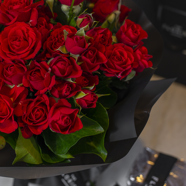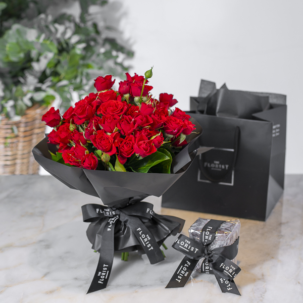 باقة يد من الزهور البيبي جوري الحمراء مع شوكولاتة.