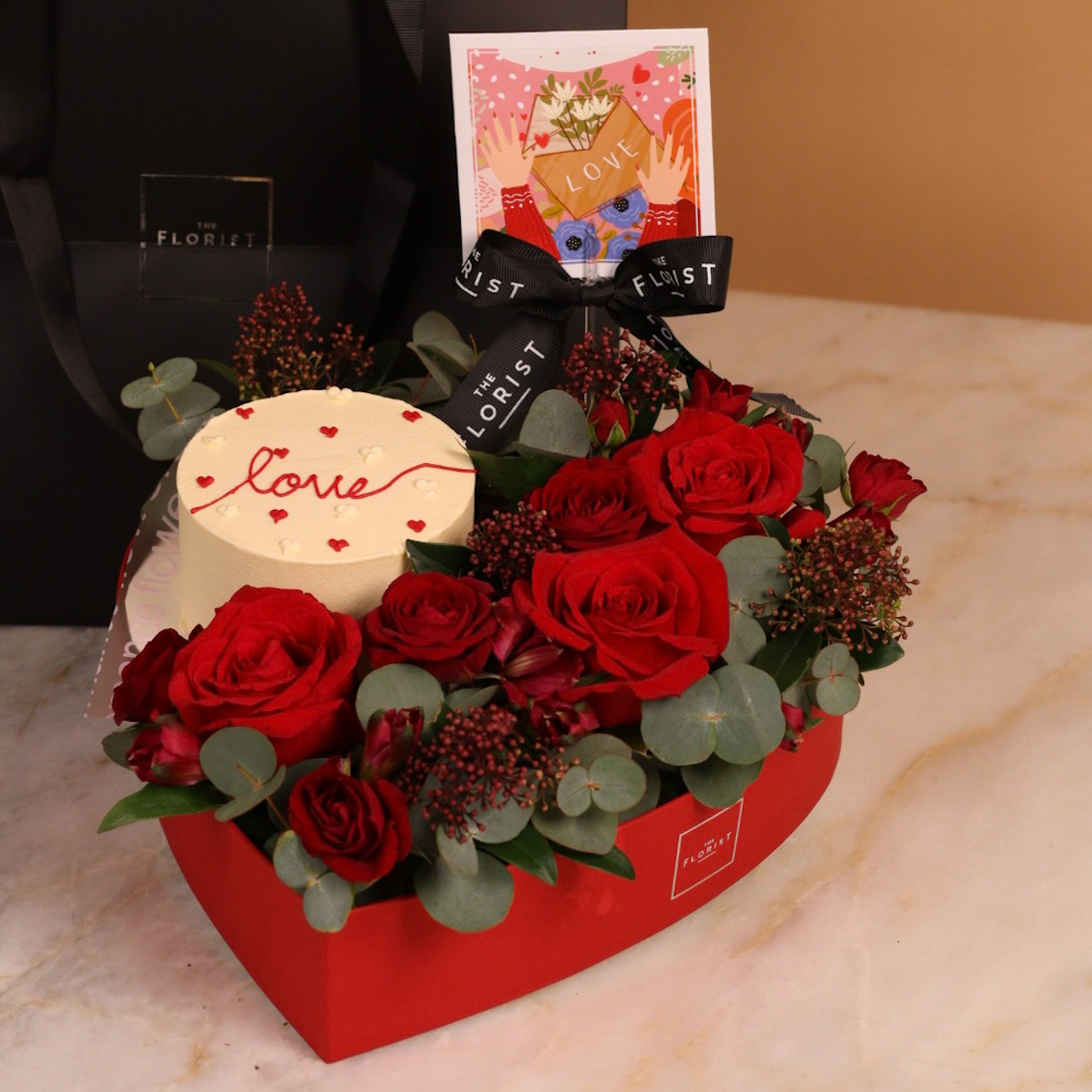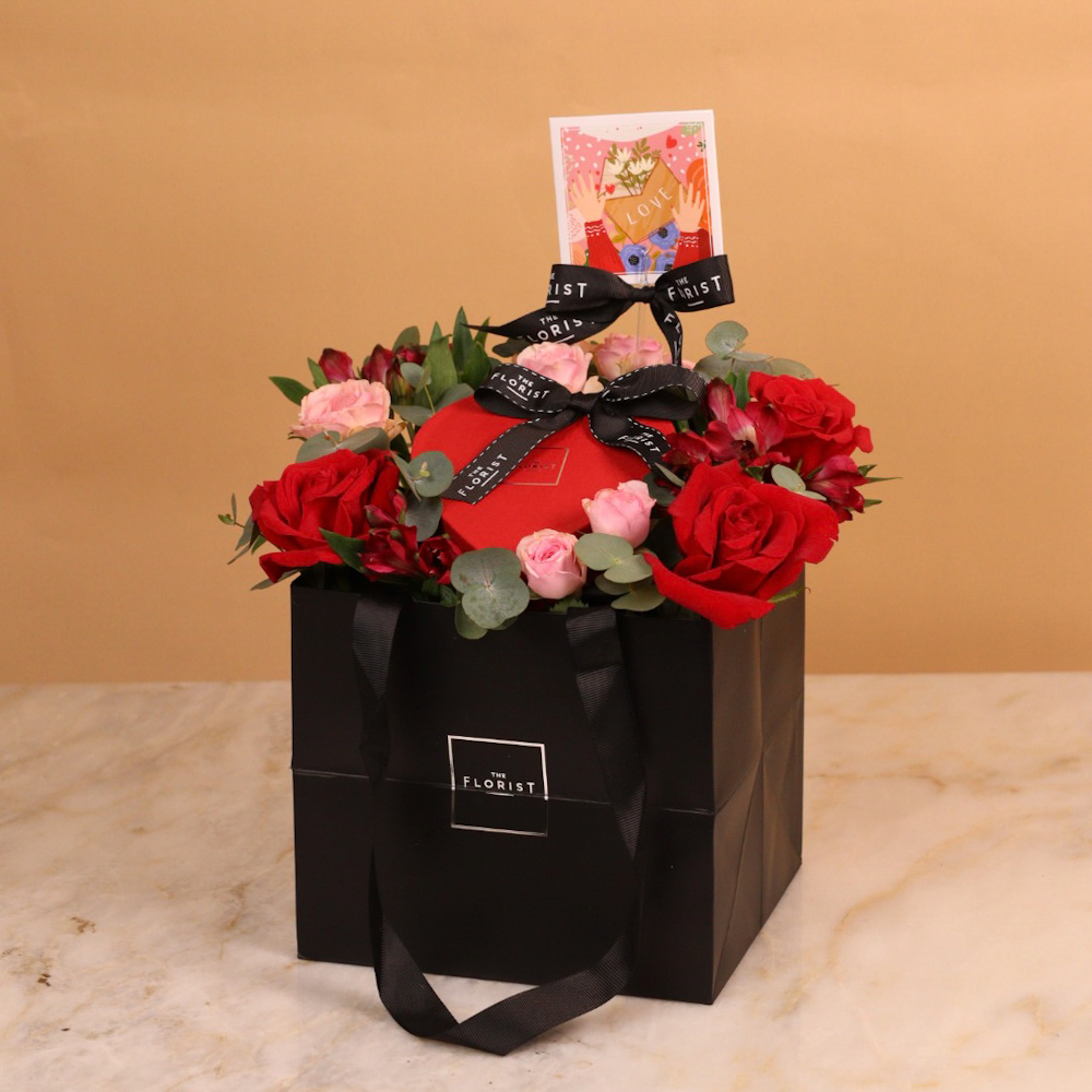 يحتوي التنسيق على باقة صغيرة من الزهور البرتقالية مع شوكولاتة.