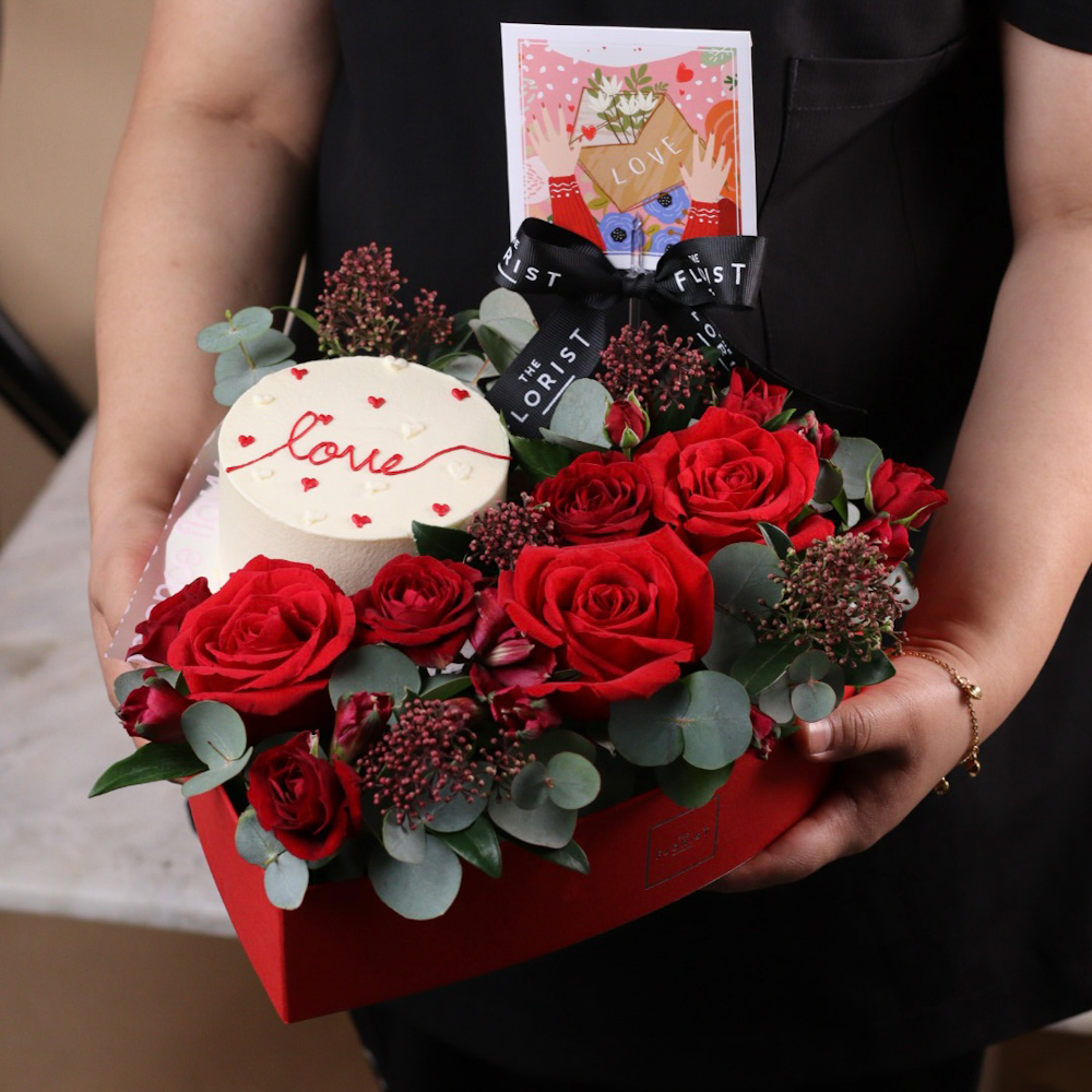 بوكس القلب بتصميم أنيق يضم أزهار الجوري باللون الـحمر وكيكة صغيرة، مثالية لشخص واحد.