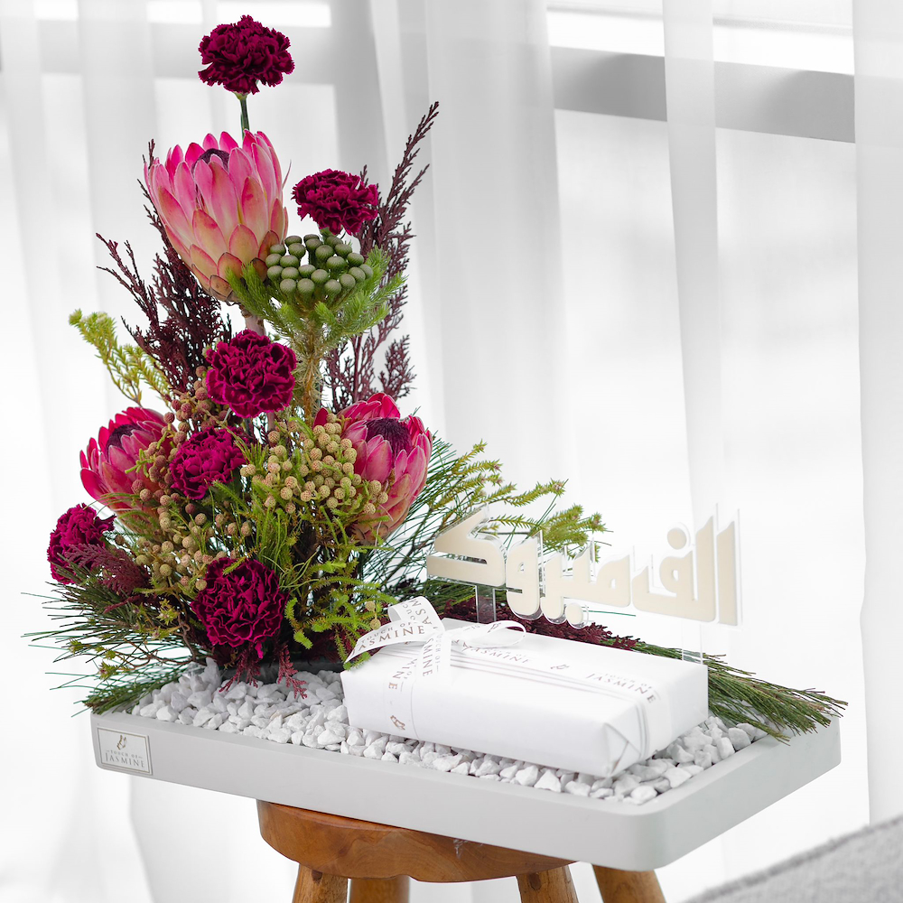 هذه الباقة تحتوي على زهور البروتيا والكرنيشن مع الشوكولاتة.