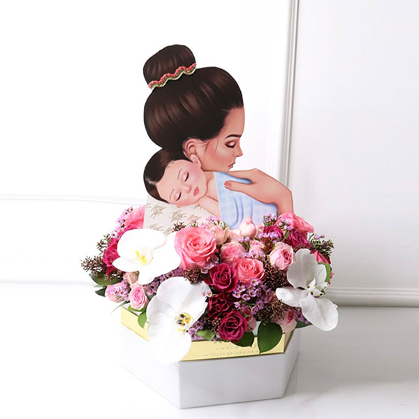 هذه السلة السداسية تحتوي على زهور الجوري، البيبي جوري والأوركيد كت.