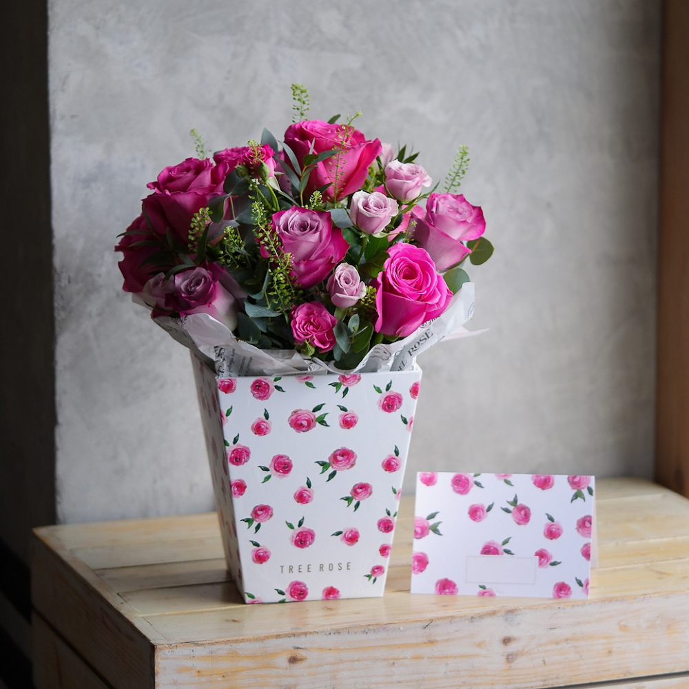 صندوق ورقي يحتوي على الجوري الوردي.