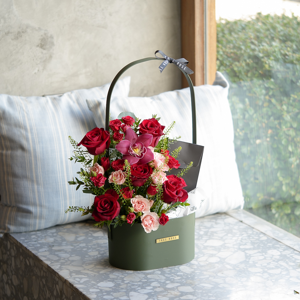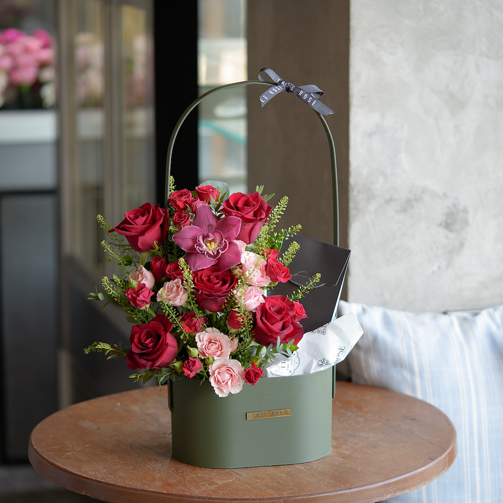 سلة معدنية تحتوي على الجوري والبيبي جوري مع 10 قطع شوكولاتة بيضاوية وقطعة من الشوكولاتة بتصميم القلب.