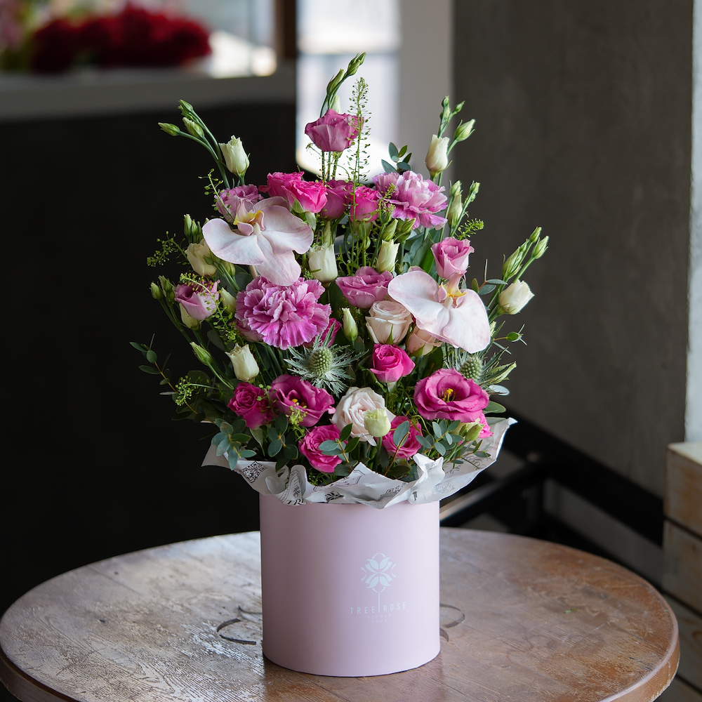 فازة تحتوي على زهور الجوري، الكارنيشن والأوركيد، مرتبة بشكل جميل.