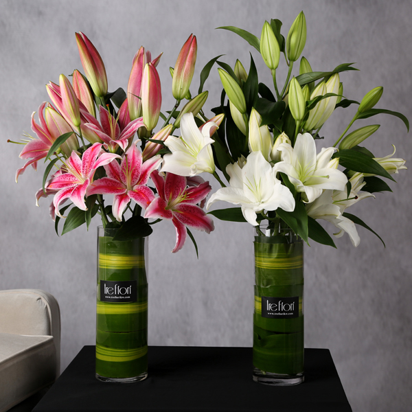 زهور الكزابلانكا منسقة بفازتين.
