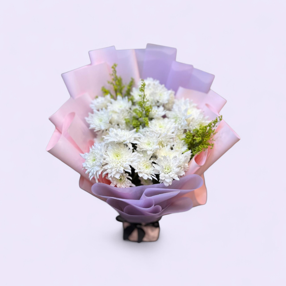 باقة يد منسقة بزهور الكريز والسوليداجو بتغليف جميل ورائع.