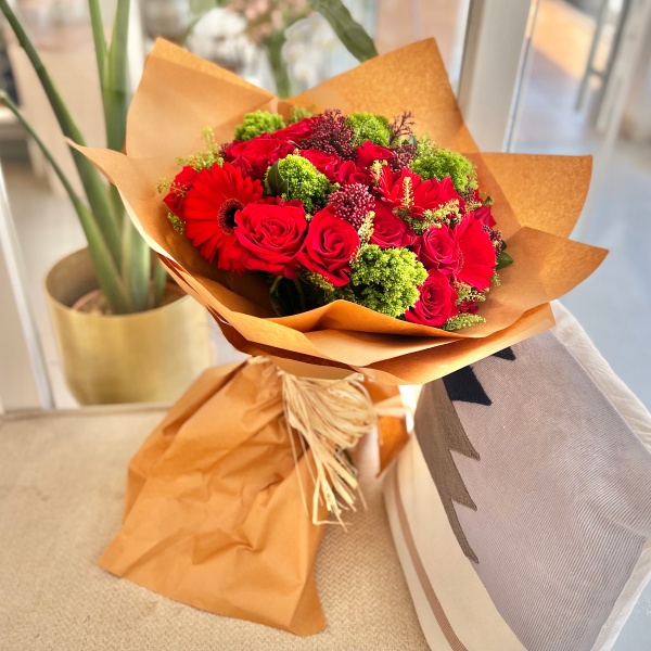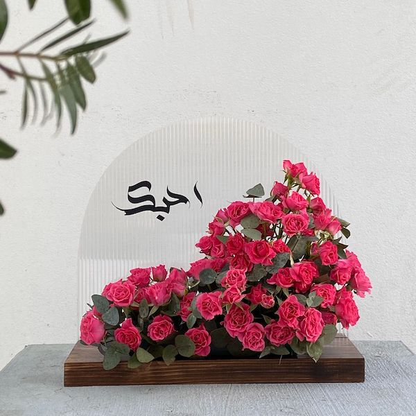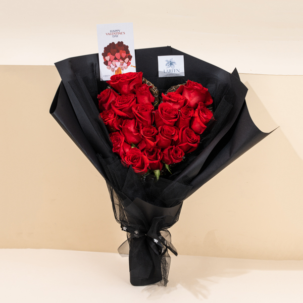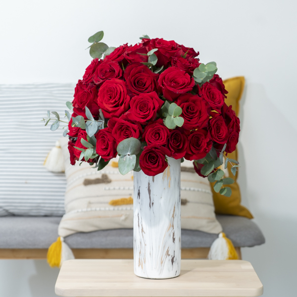 زهور الجوري الحمراء منسقة بصندوق خشبي.