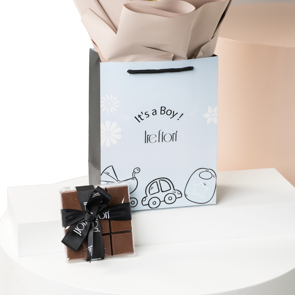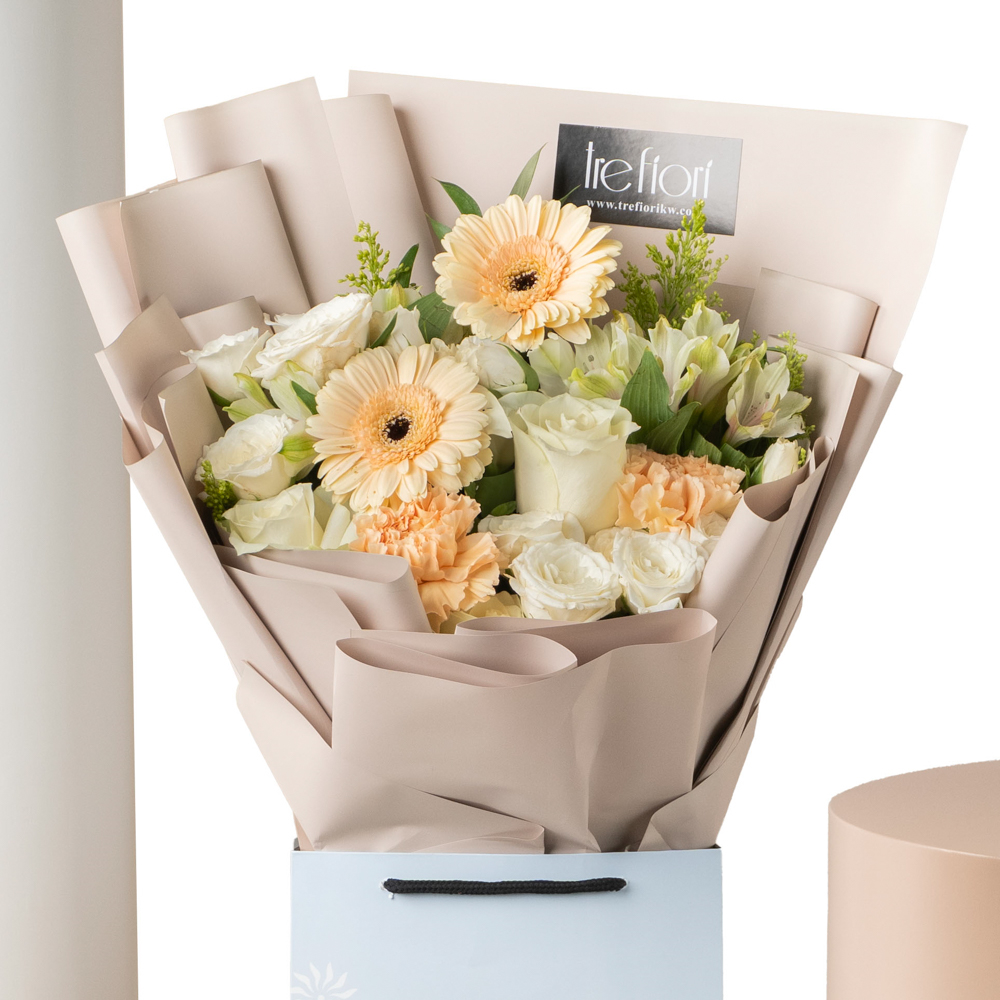 زهور الالستوميريا والروز والجربيرا منسقة بحقيبة مع 9 حبات شوكولاتة.