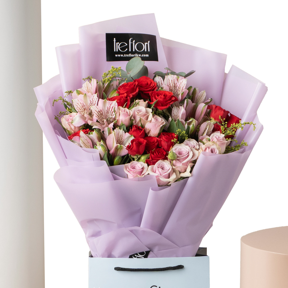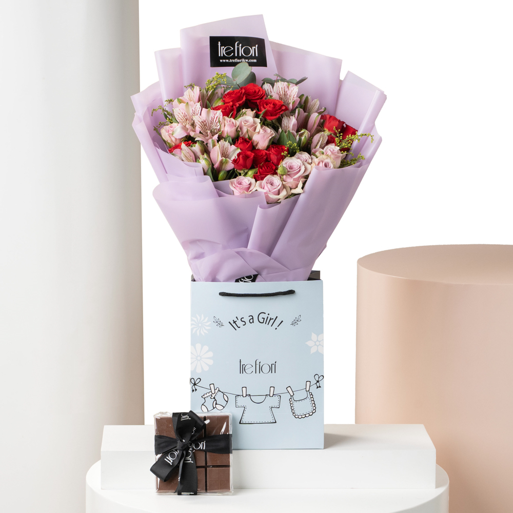 زهور الالستوميريا والبيبي جوري بكيس مع 9 حبات شوكولاتة.