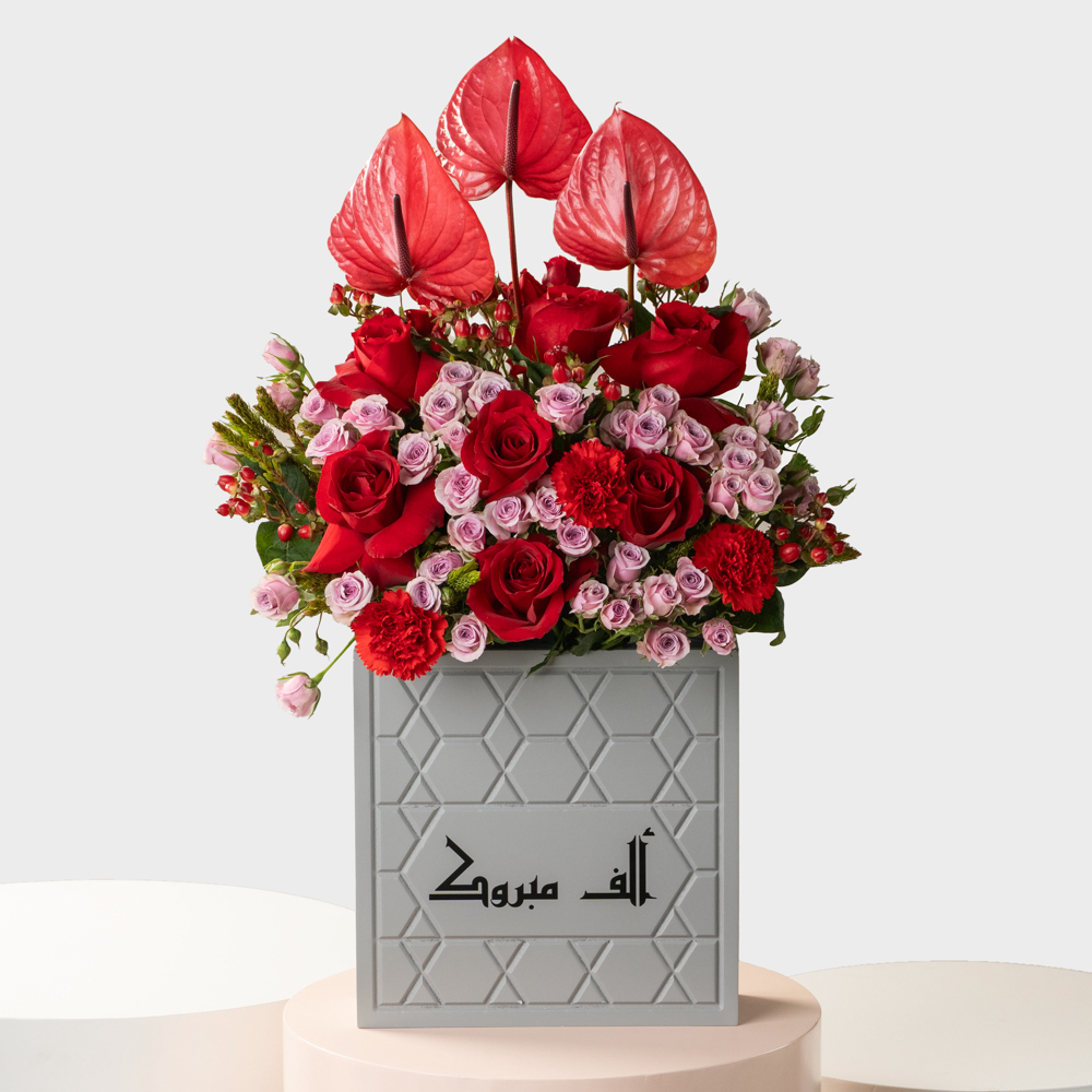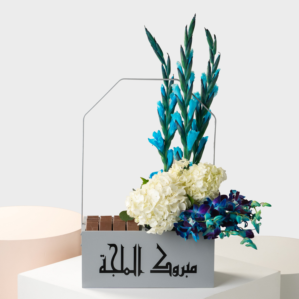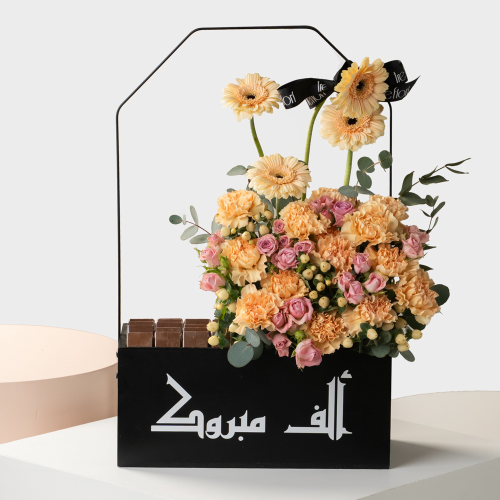 تصميم عروسه لسنة 2024 منسق بزهور البيبي جوري وشوكولاتة.