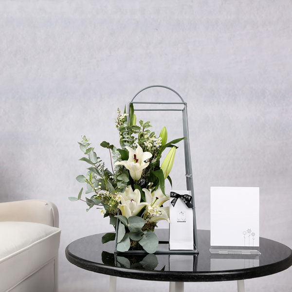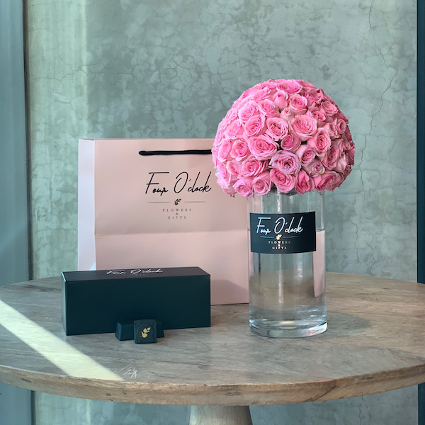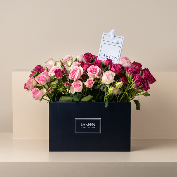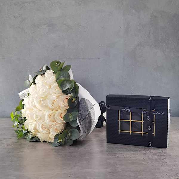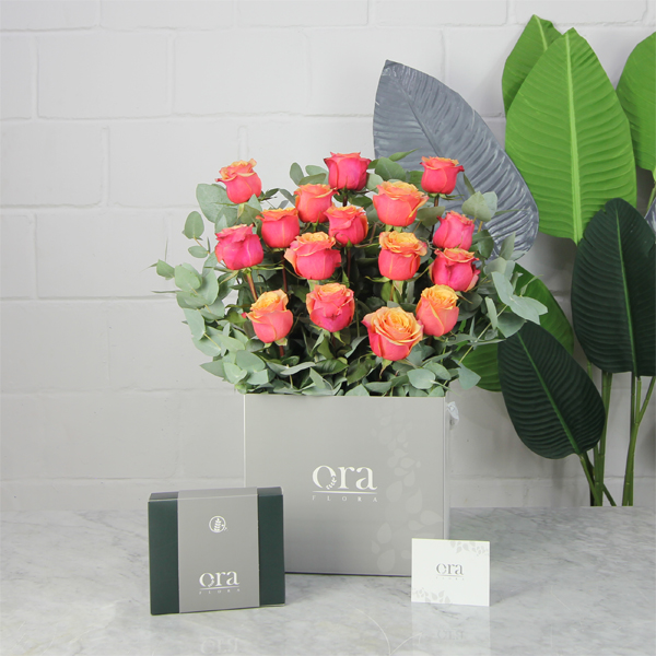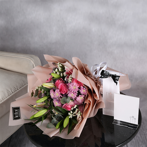 باقة يد منسقة بزهور منوعة مع علبة الشوكولاتة.