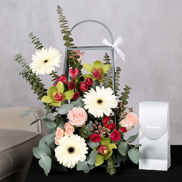 ستاند حديد رمادي يحتوي على زهور الجربيرا، أوراق اليكوليبتس الخضراء وكيس شوكولاتة.