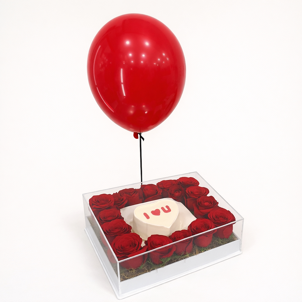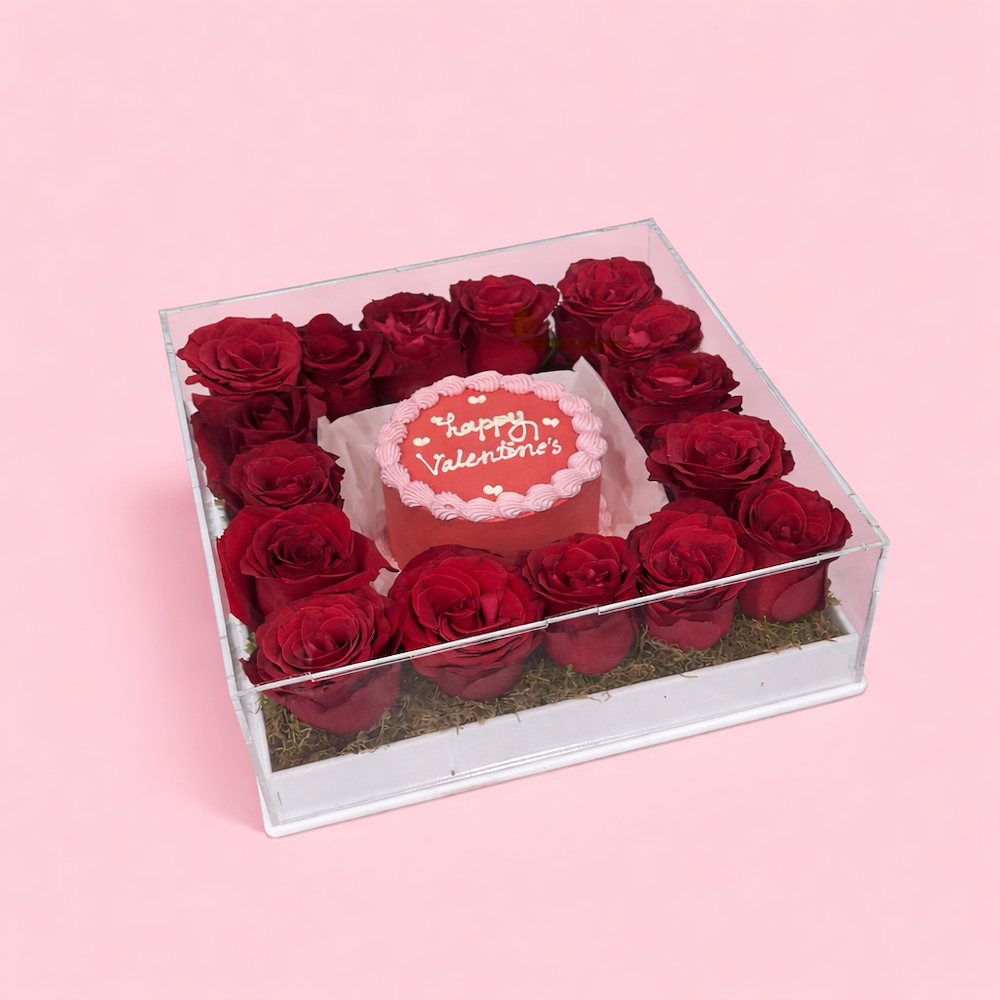 باقة يد مليئة بالبيبي روز مع كيكة بينتو.
