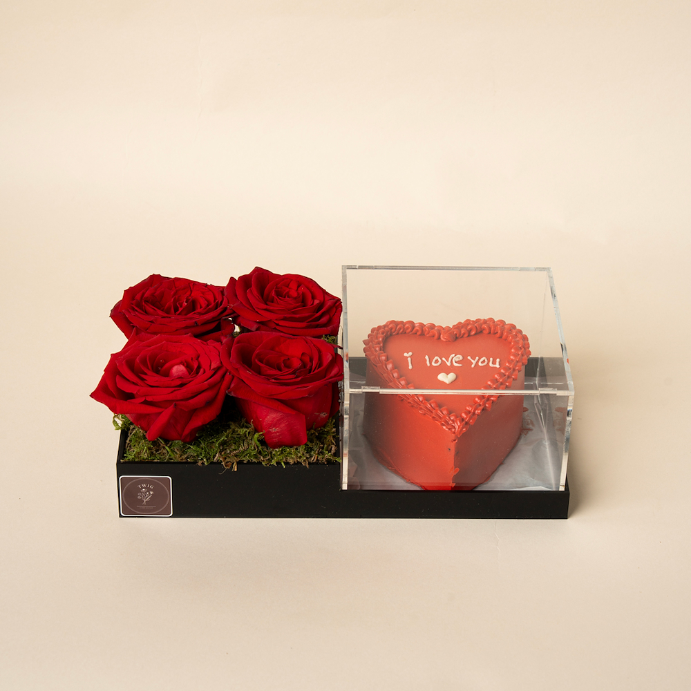 يحتوي هذا البوكس الأكريليك على أزهار البيبي جوري مع كيكة.