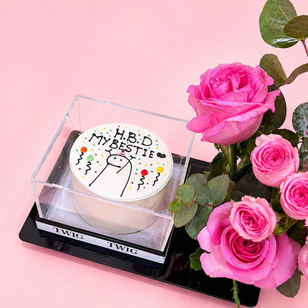 قاعدة أكريليك تتميز بأزهار البيبي روز، الجوري وزهرة الجربيرا مع كيكة التخرج وبالونه.