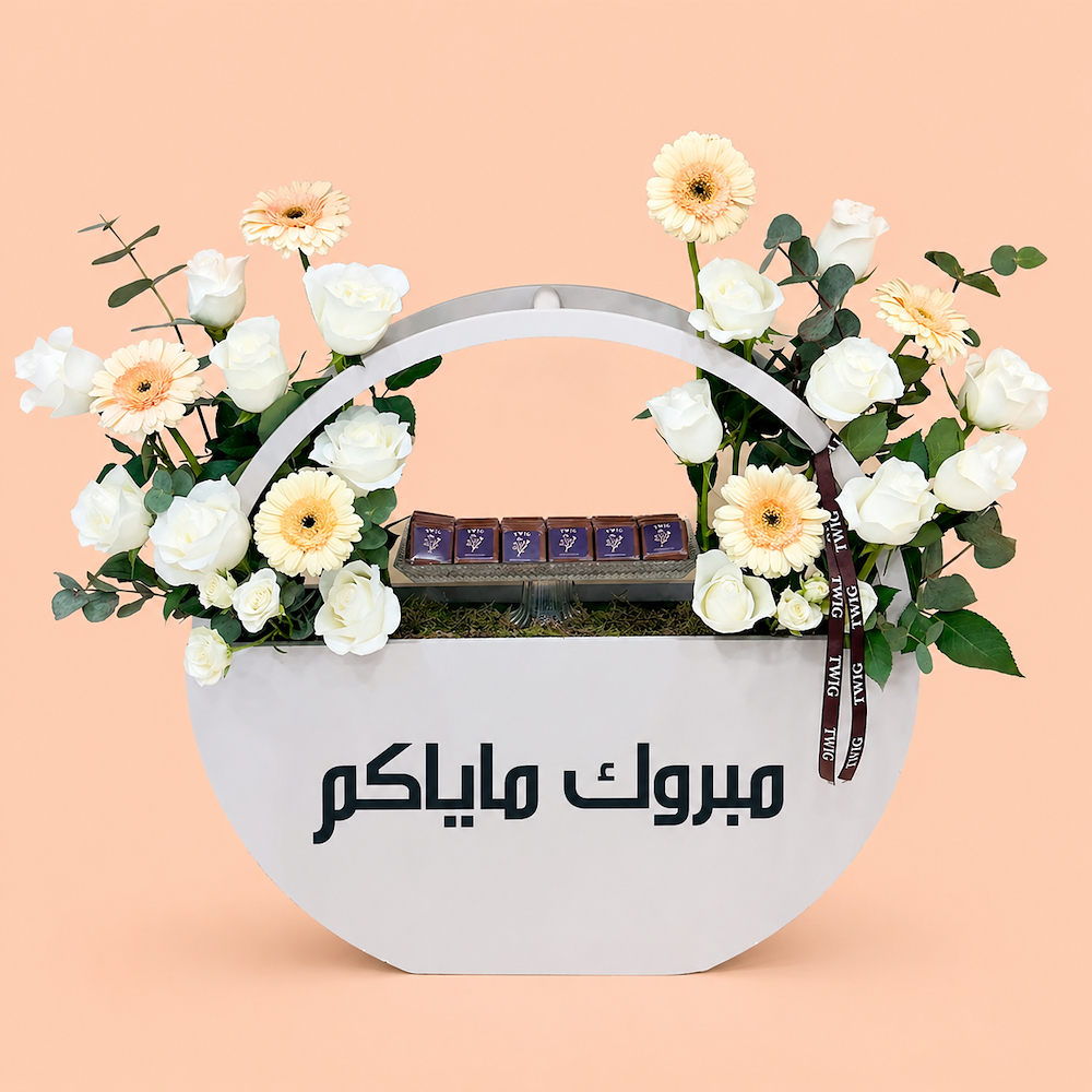 باقة تحتوي على زهور الجيربيرا والجوري، مرتبة بشكل جميل في ستاند خشبي. تأتي مع 20 قطعة من الشوكولاتة في صينية من الكريستال.