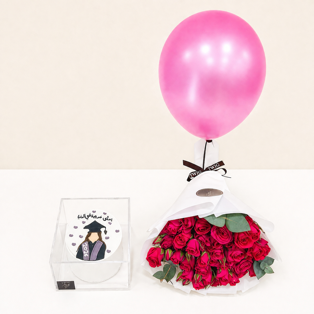 صندوق أنيق مزين بزهور الجوري والجيربيرا، مع كيكة صغيرة مع كتابة قابلة للتخصيص باللغتين الإنجليزية والعربية.