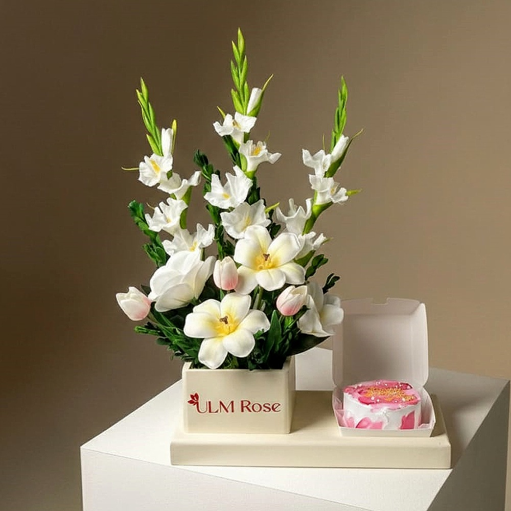 تحتوي هذه الباقة المميزة على زهور التوليب، الجلاديولس والماغنوليا الصناعية مع كيكة.
