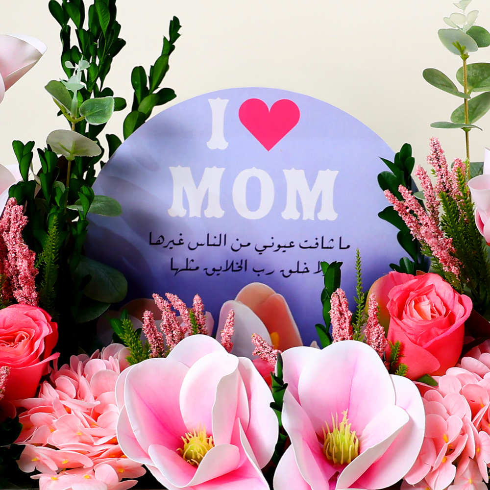 تحتوي هذه الباقة على الزهور الصناعية المميزة (الهايدرينجا، التوليب والجوري) والشوكولاتة البلجيكية.