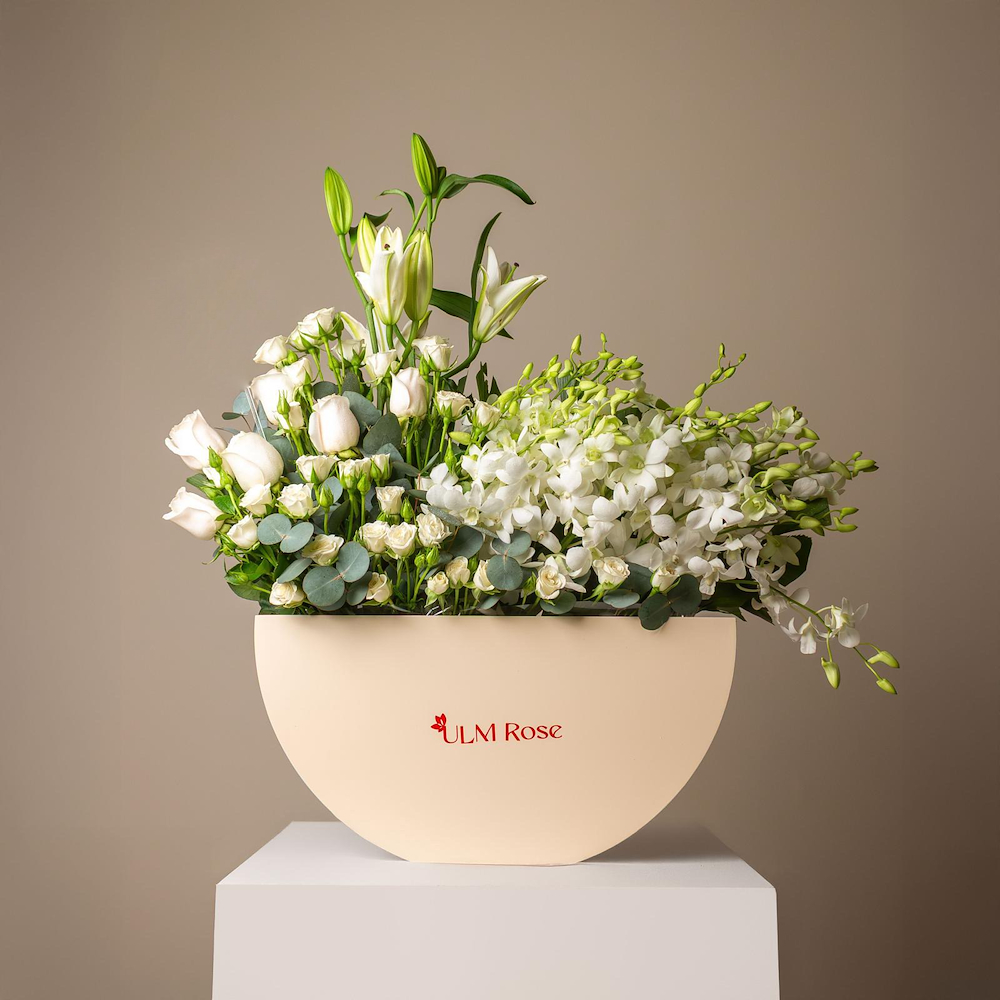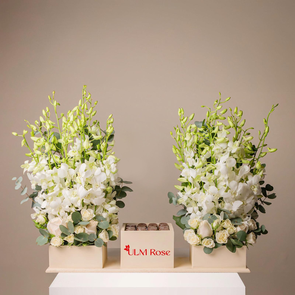هذه الباقة المميزة تحتوي على نباتات الأوركيد الهولندية، البيبي جوري والجوري.