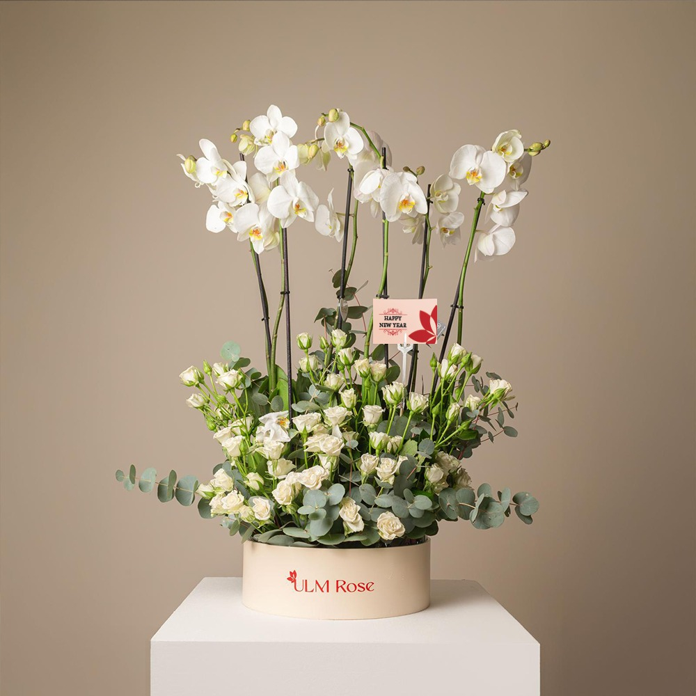 بوكس فاخر مليء بنباتات الاوركيد والبيبي جوري.
