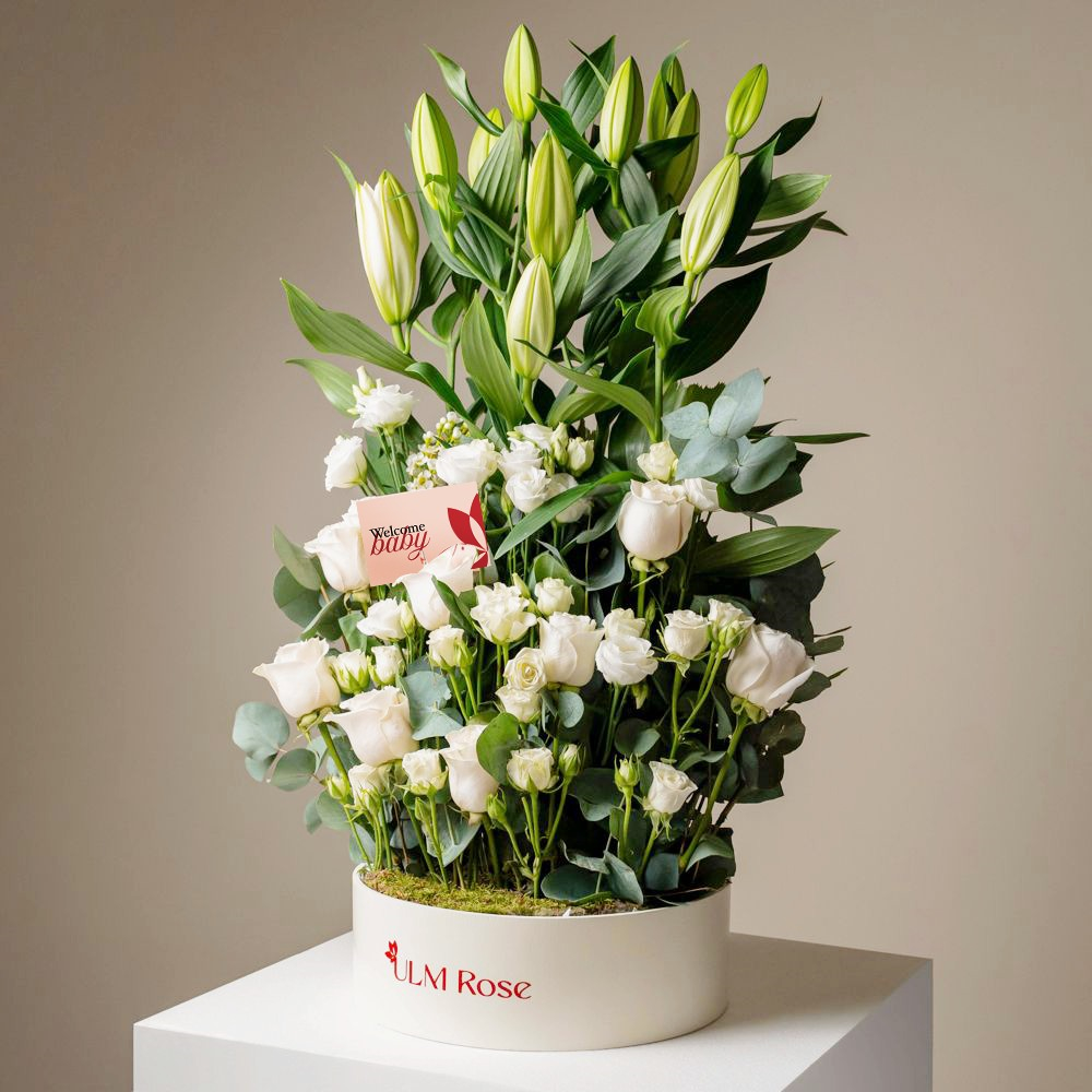 باقة تحتوي على زهور الجوري، البيبي جوري، الإستوما والكازابلانكا، مرتبة بشكل جميل في صندوق.