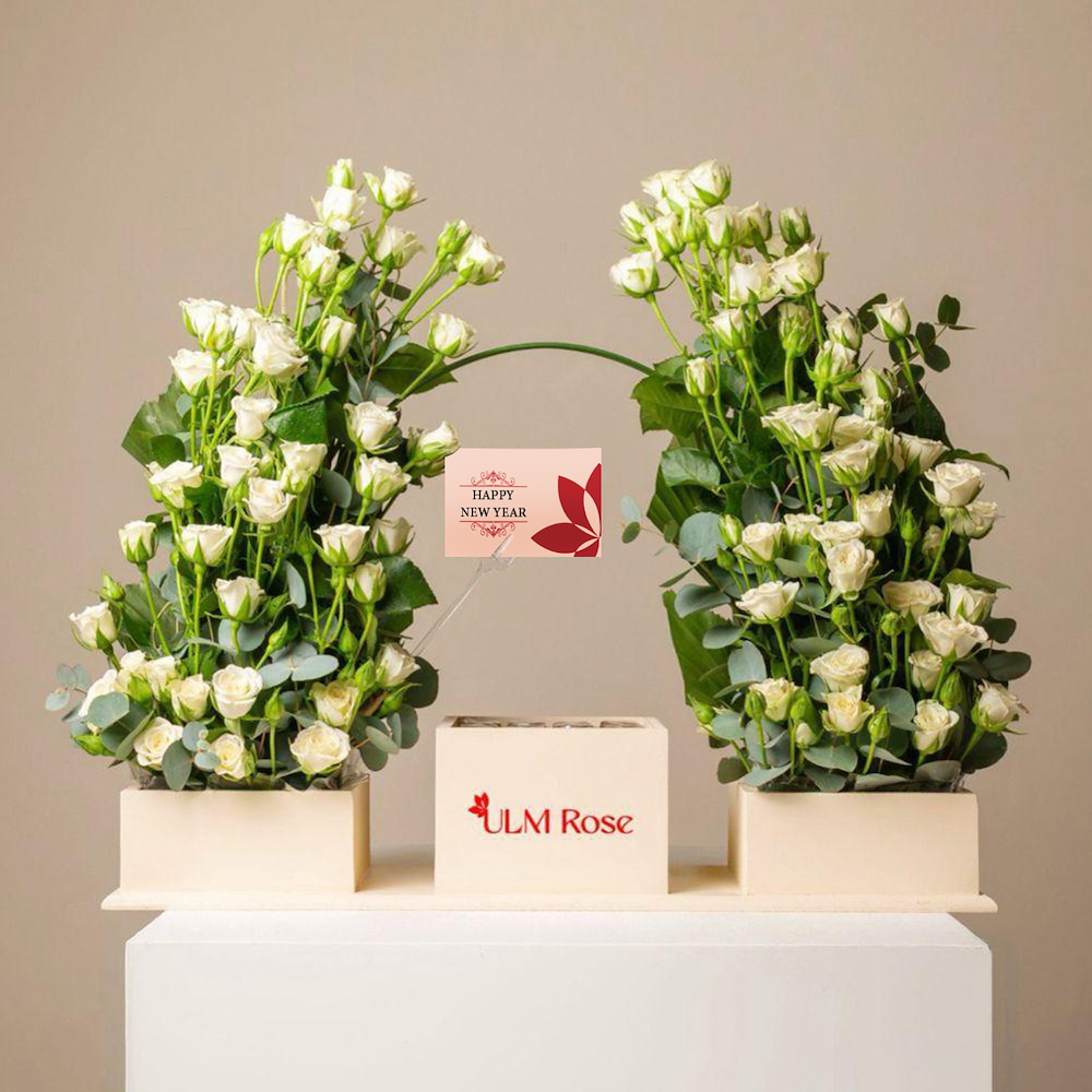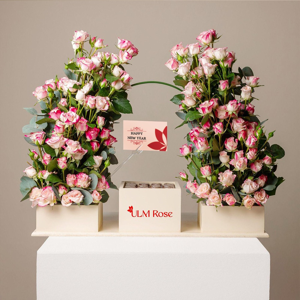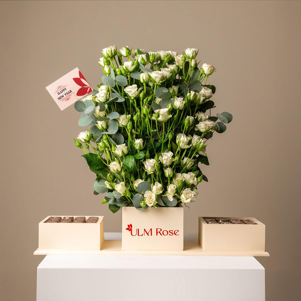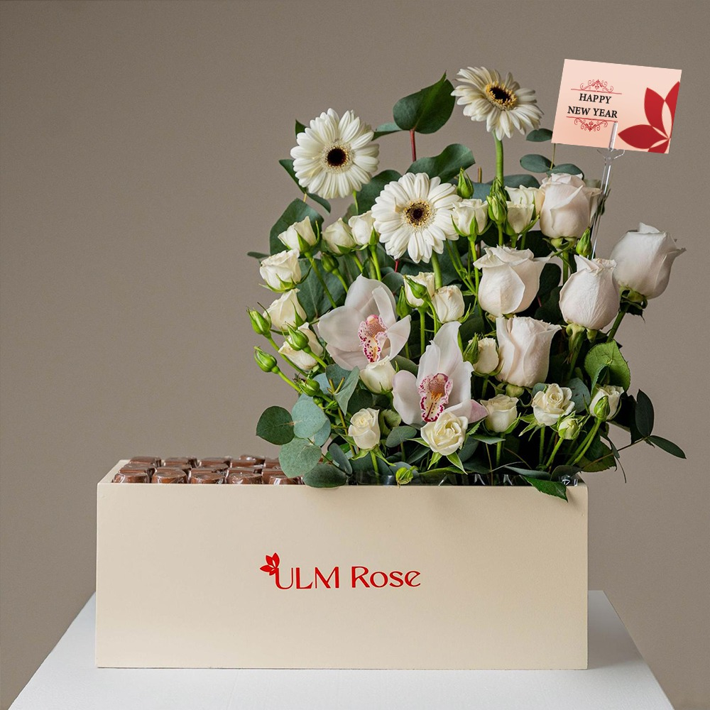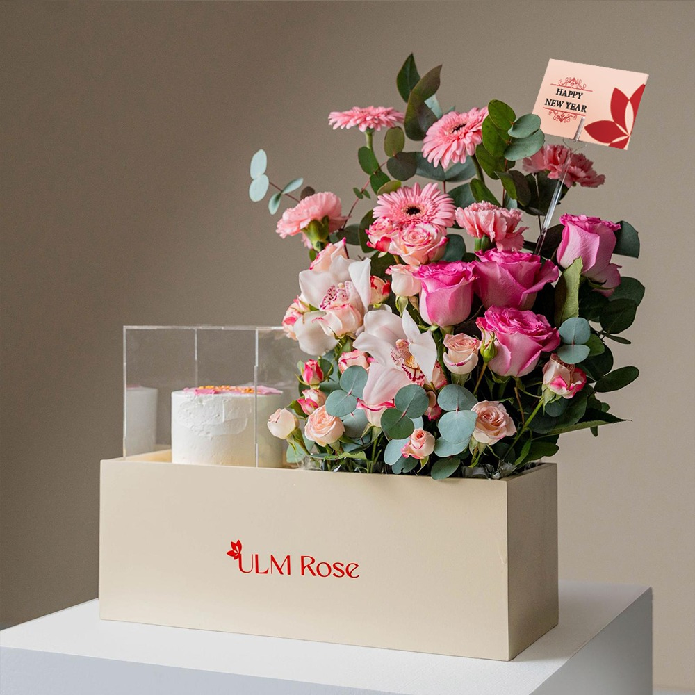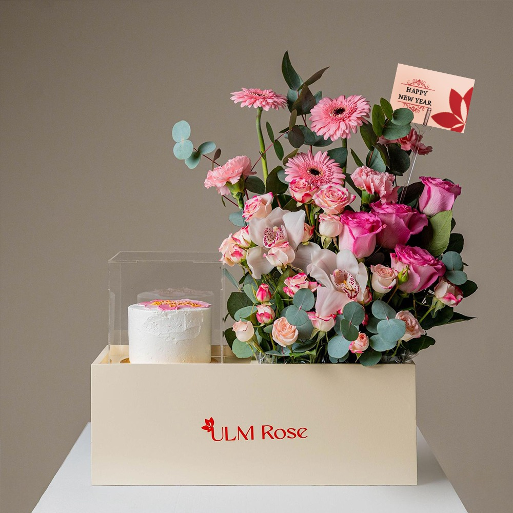 باقة تحتوي على زهور الجوري، البيي جوري، الجيربيرا، الكارنيشن والسمبيديوم، مرتبة بشكل جميل في صندوق مع كيكة.