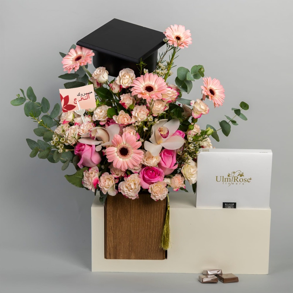 باقة تحتوي على زهور الجيربيرا، الجوري، زهور الواكس وأوراق الأوكالبتوس مع الشوكولاتة.