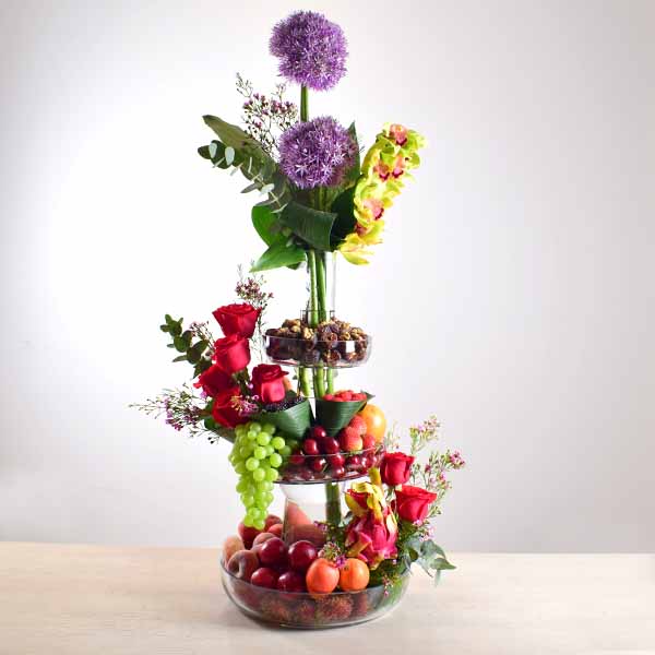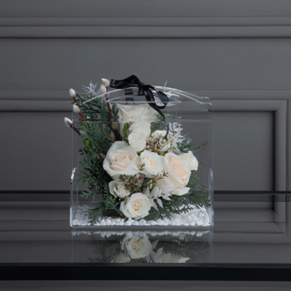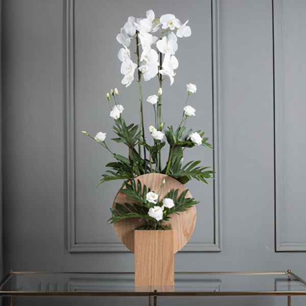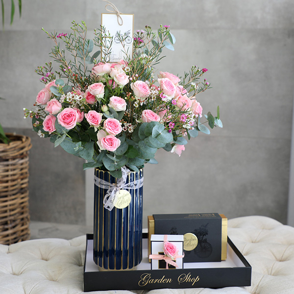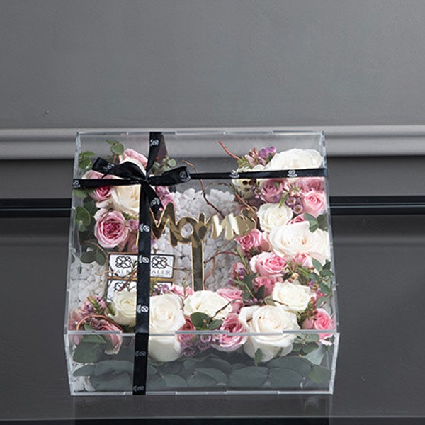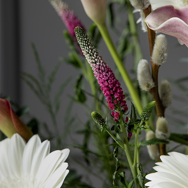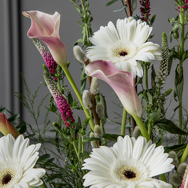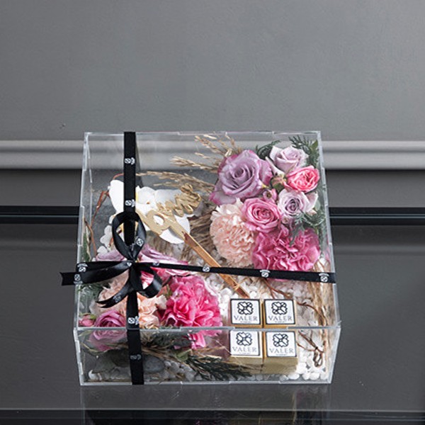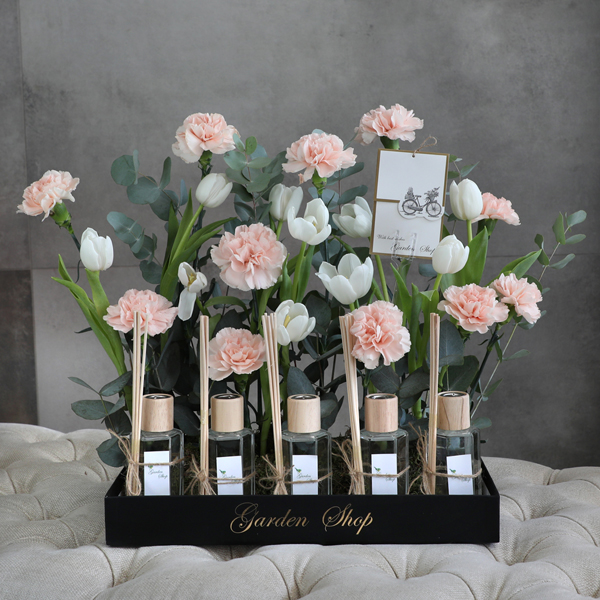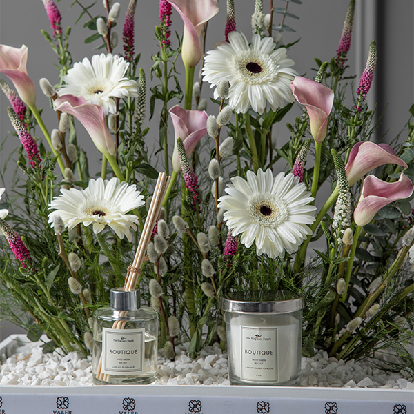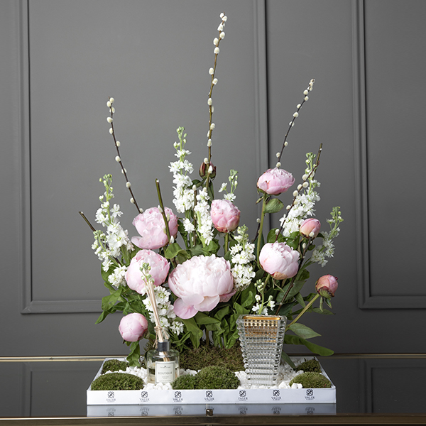 صينية تحتوي على مجموعة من الجربيرا، الكالا والفيرونيكا بالإضافة الى معطر وشمعة.