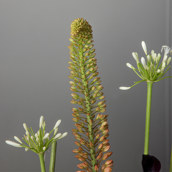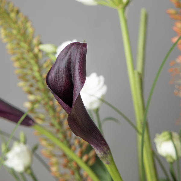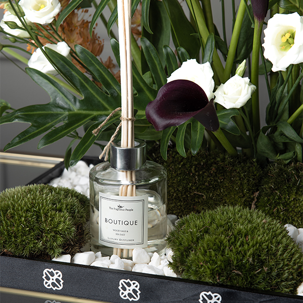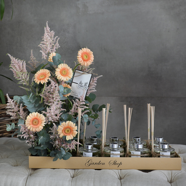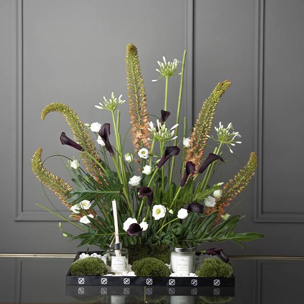 صينية تحتوي على زهور الاراميروس، الكالا، الليسانتوس، الاقابانثوس وأوراق الفليدندرون مع شمعة ومعطر.